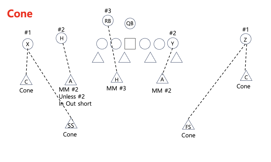 예외> #1 리시버가 under route로 가면 #1 리시버를 맨투맨 수비한다.