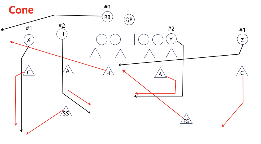 Cone은 (다음에 소개할) Vice 커버리지의 친척이다. 둘 다 기본적으로 다이아고날 브라켓을 기본으로 한다. 하지만 둘 다 호리존탈 브라켓의 태그 형태로 많이 사용된다. 콘과 바이스의 목적은 동일하다. 가장 위험한 리시버를 브라켓 커버리지를 하면서, 반대편에서는 별개의 트라이앵글 커버리지를 사용하게 하는 것이다.