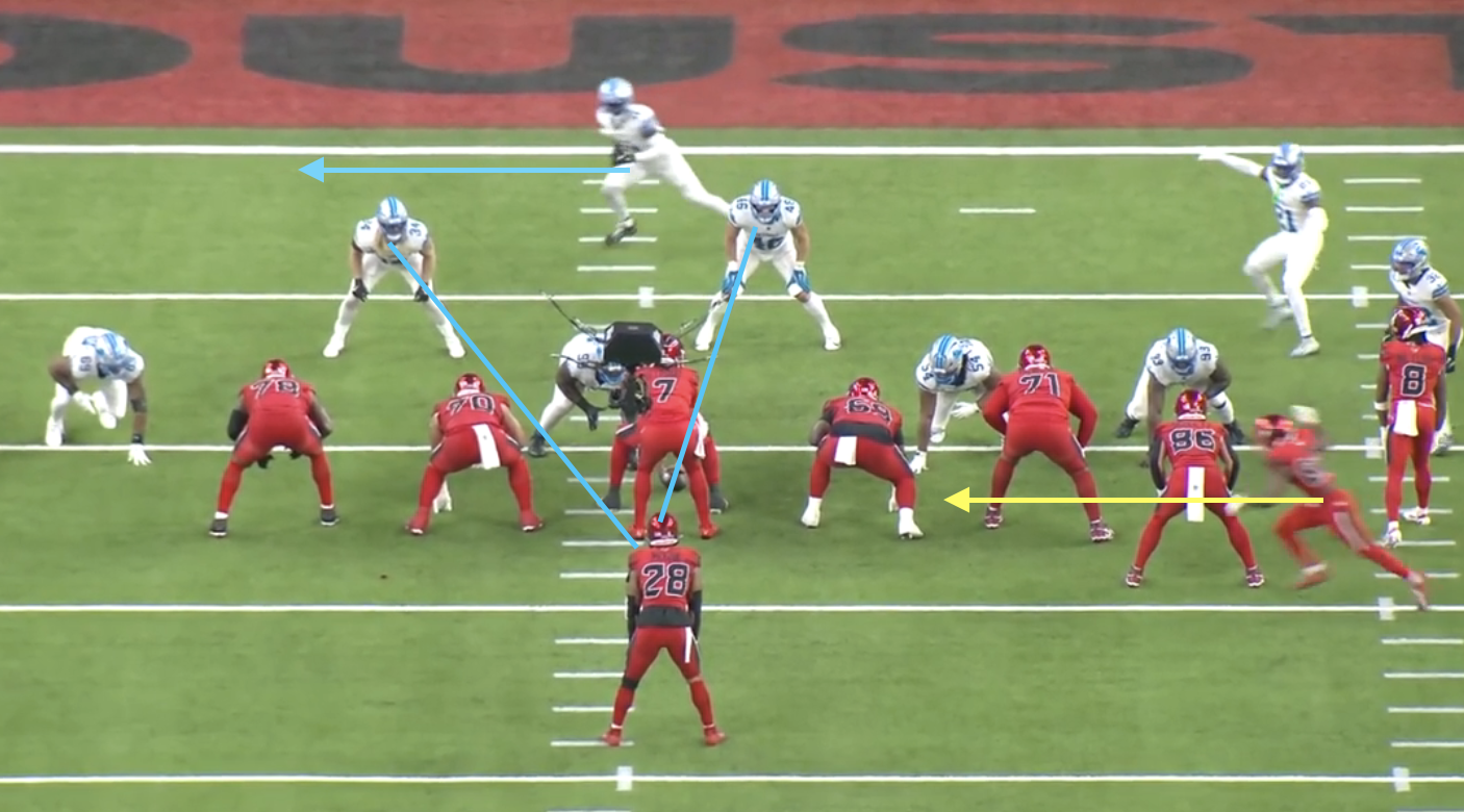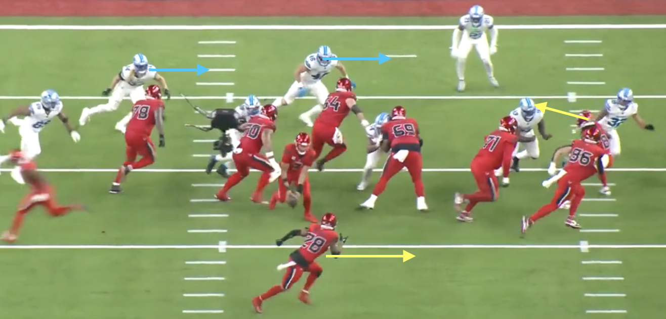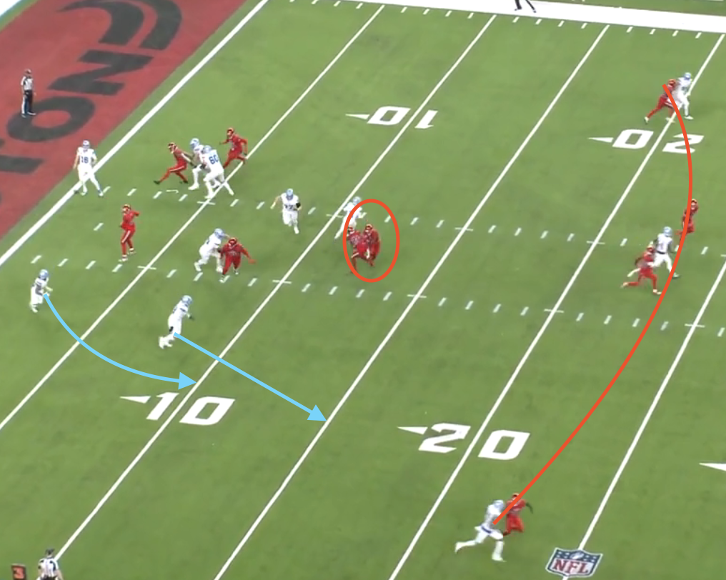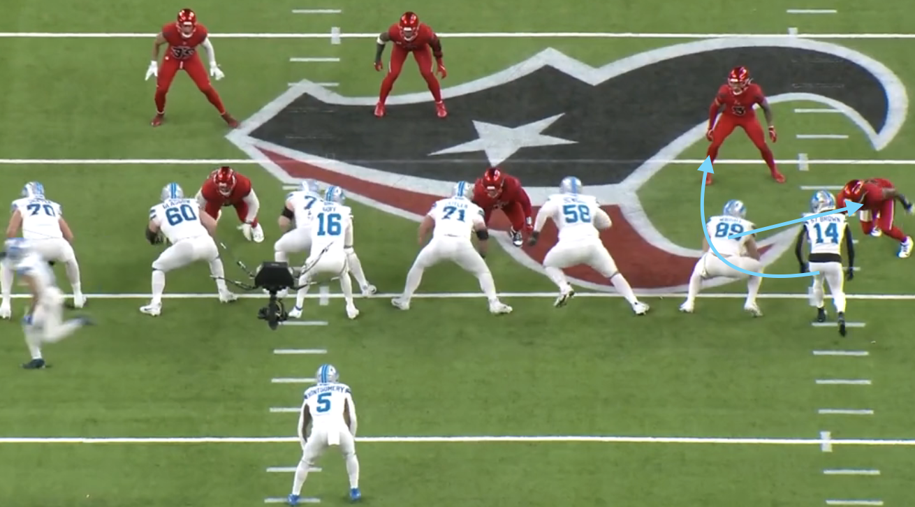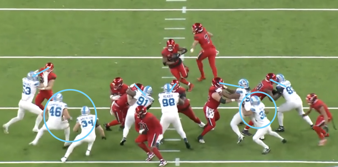 반면에 라이온스는 리시버 아몬라(14번)이 세이프티인 피트리를, 타이트엔드(89번)는 DE를 막도록 합니다.