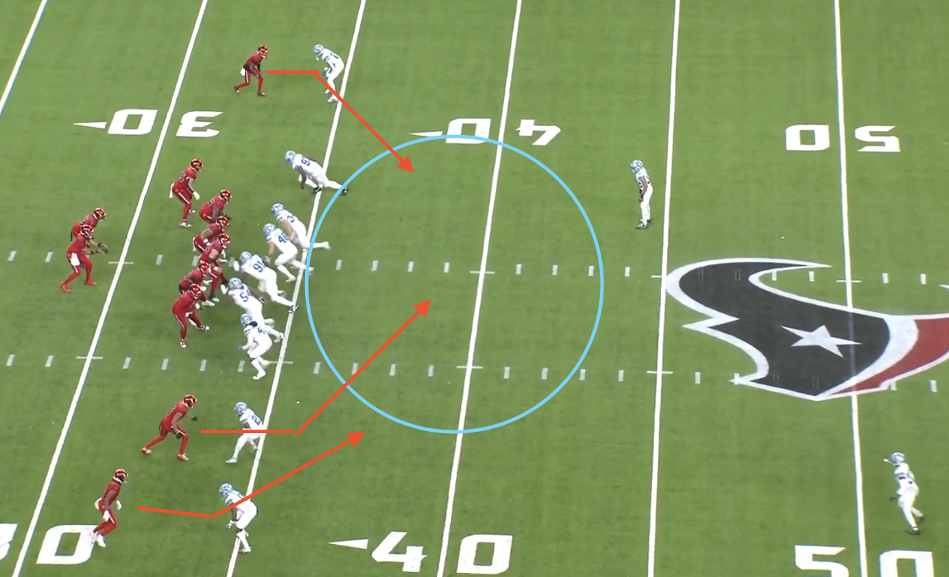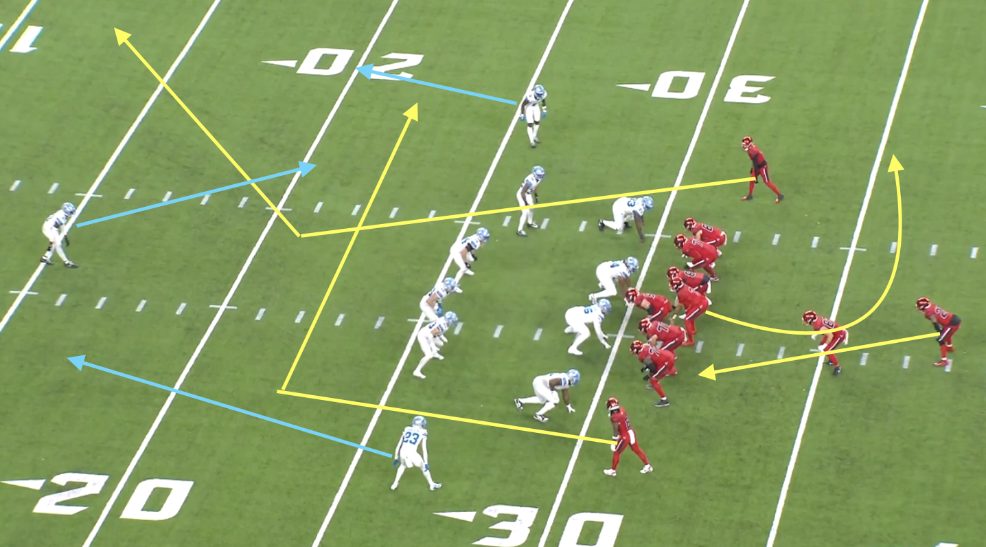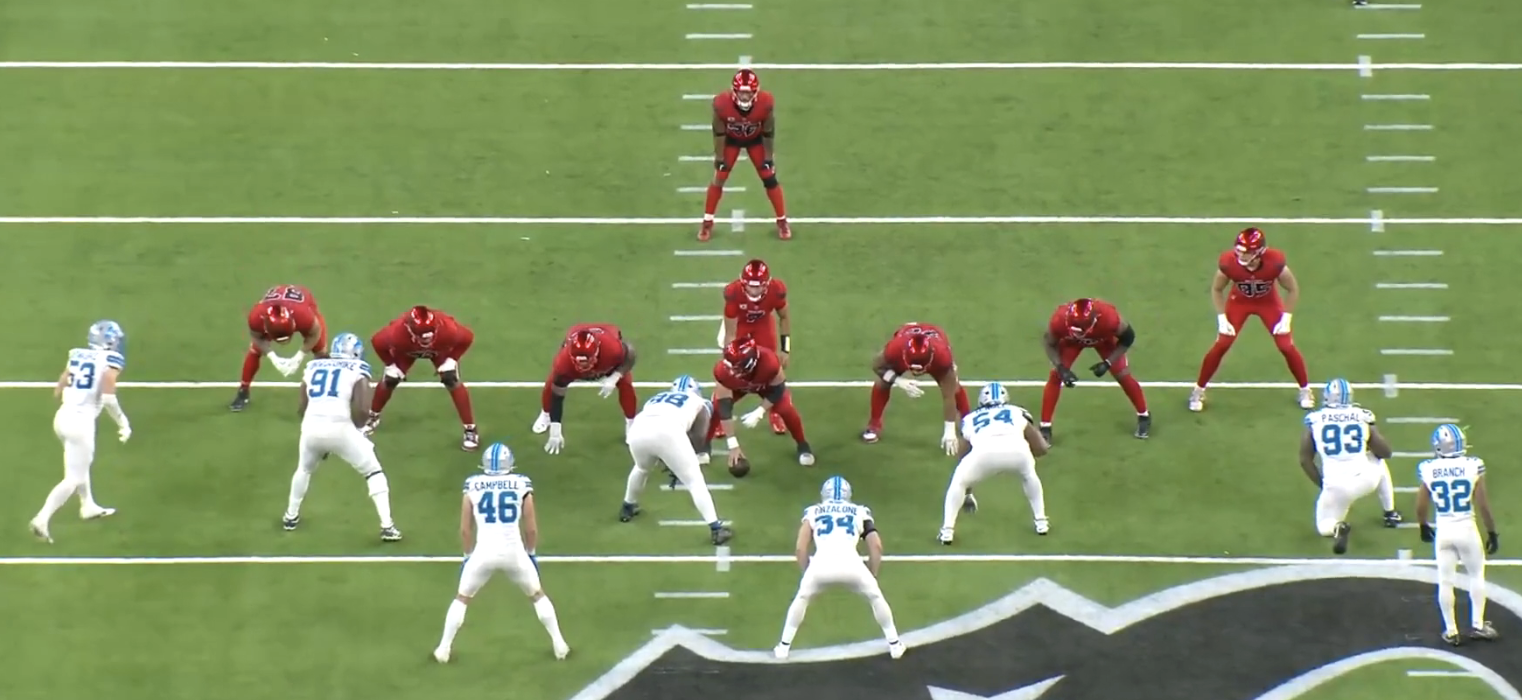 반면에 라이온스는 리시버 아몬라(14번)이 세이프티인 피트리를, 타이트엔드(89번)는 DE를 막도록 합니다.