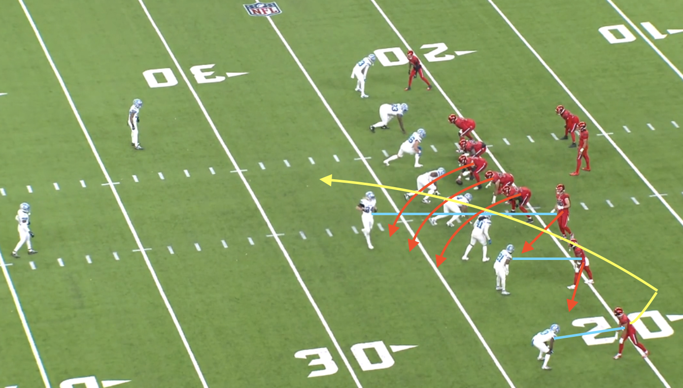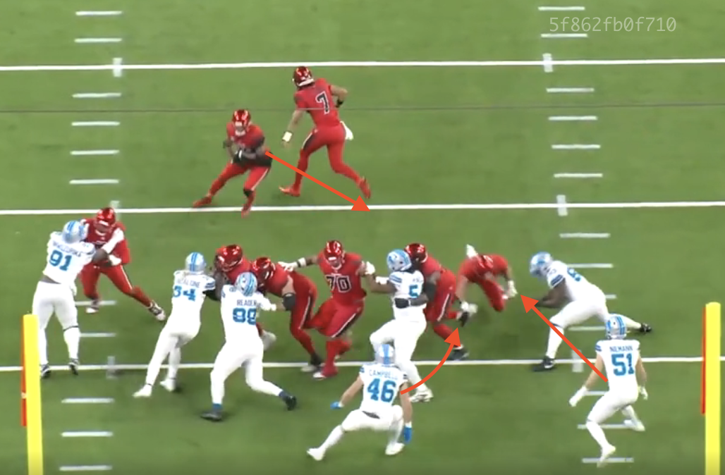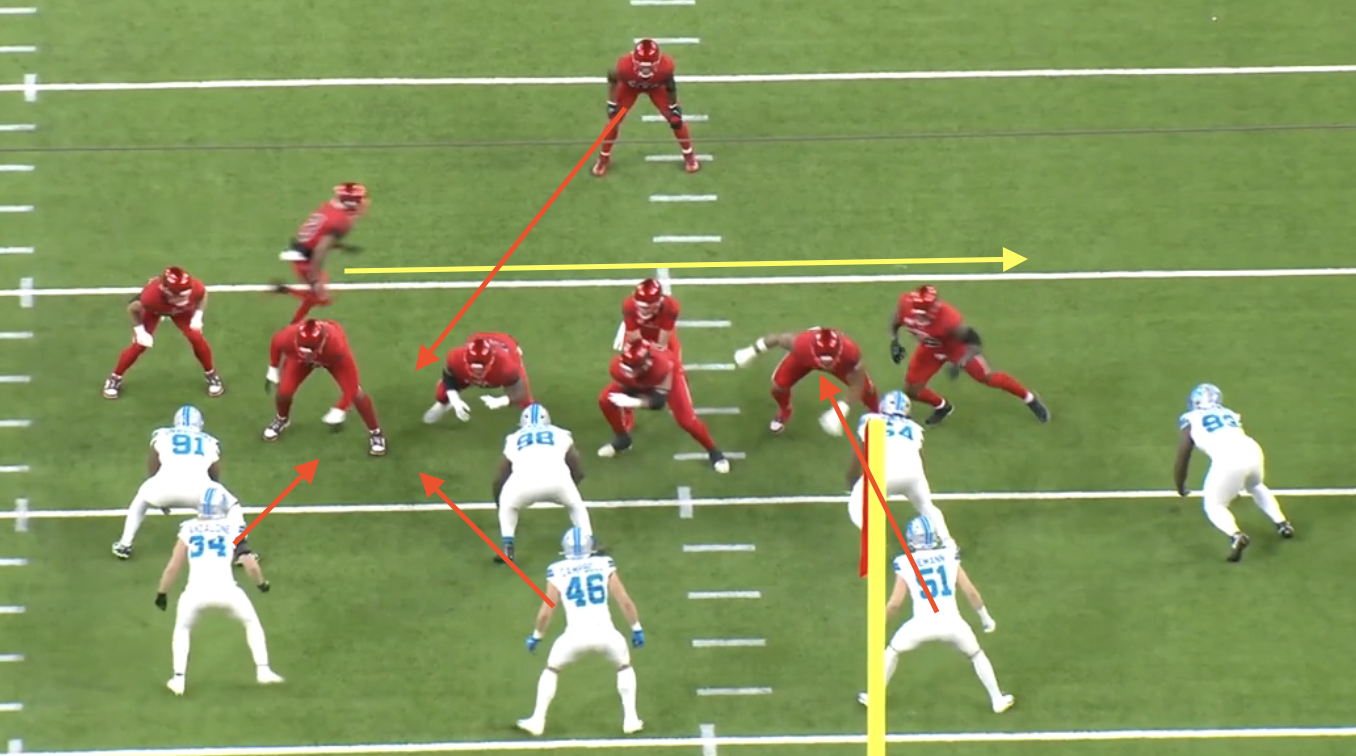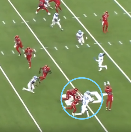 델의 모션에는 세이프티만 반응 합니다. 라인베커는 오로지 믹슨의 움직임에만 반응을 합니다. 근데 가장 의아한 부분은 왜 리시버인 메치 (8번)에게 DE를 블락하도록 시키냐 하는 것입니다. 메치에게 DE 블락을 맡기고 하워드는 슐츠와 함께 바깥에 블락을 갑니다. 하지만 런 작전임을 파악하고 있던 라이온스의 빠른 세이프티들이 스피드를 이용해 밀고 들어와 바깥쪽을 닫아버리고 믹슨은 컷백 할 수밖에 없습니다. 그래서 컷백을 하지만 거기에는 이미 메치를 넉다운시킨 DE가 기다리고 있을 뿐입니다.
