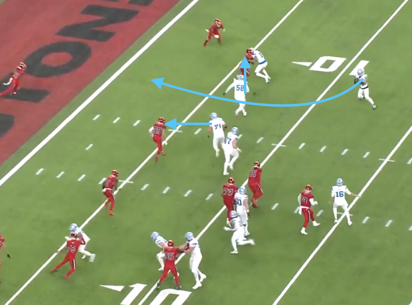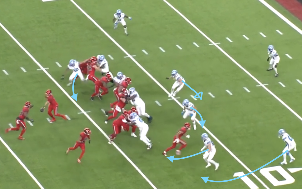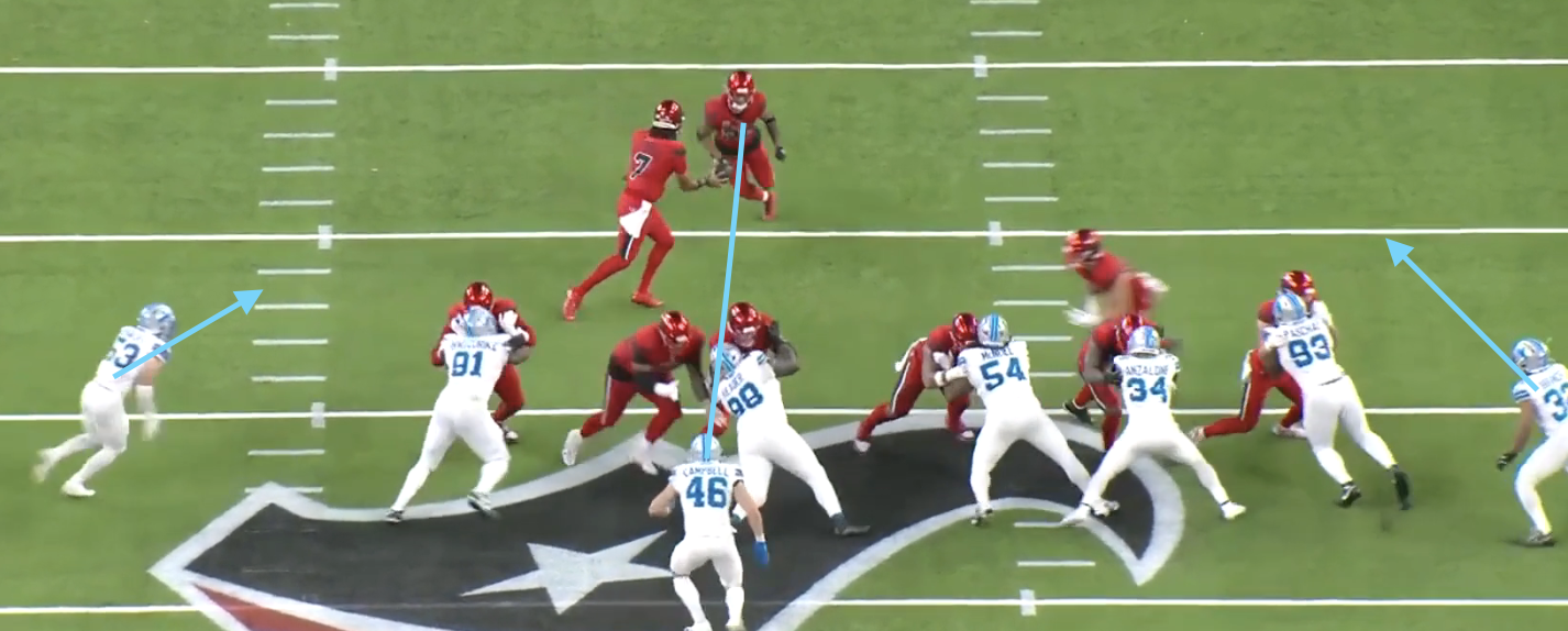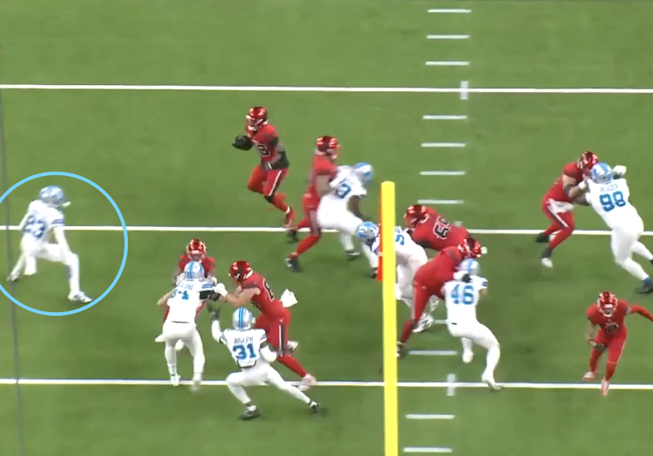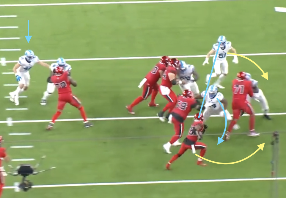델의 모션에는 세이프티만 반응 합니다. 라인베커는 오로지 믹슨의 움직임에만 반응을 합니다. 근데 가장 의아한 부분은 왜 리시버인 메치 (8번)에게 DE를 블락하도록 시키냐 하는 것입니다. 메치에게 DE 블락을 맡기고 하워드는 슐츠와 함께 바깥에 블락을 갑니다. 하지만 런 작전임을 파악하고 있던 라이온스의 빠른 세이프티들이 스피드를 이용해 밀고 들어와 바깥쪽을 닫아버리고 믹슨은 컷백 할 수밖에 없습니다. 그래서 컷백을 하지만 거기에는 이미 메치를 넉다운시킨 DE가 기다리고 있을 뿐입니다.