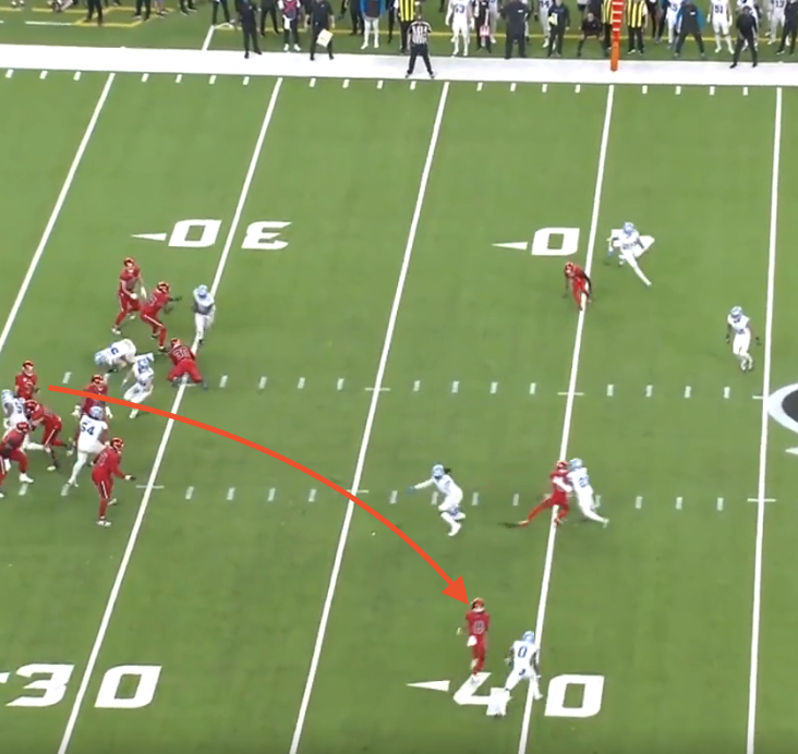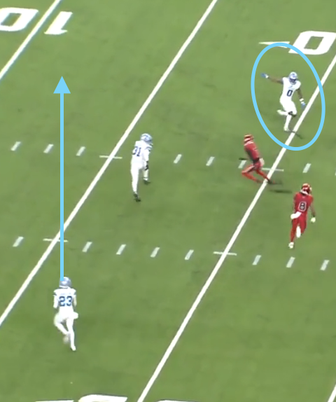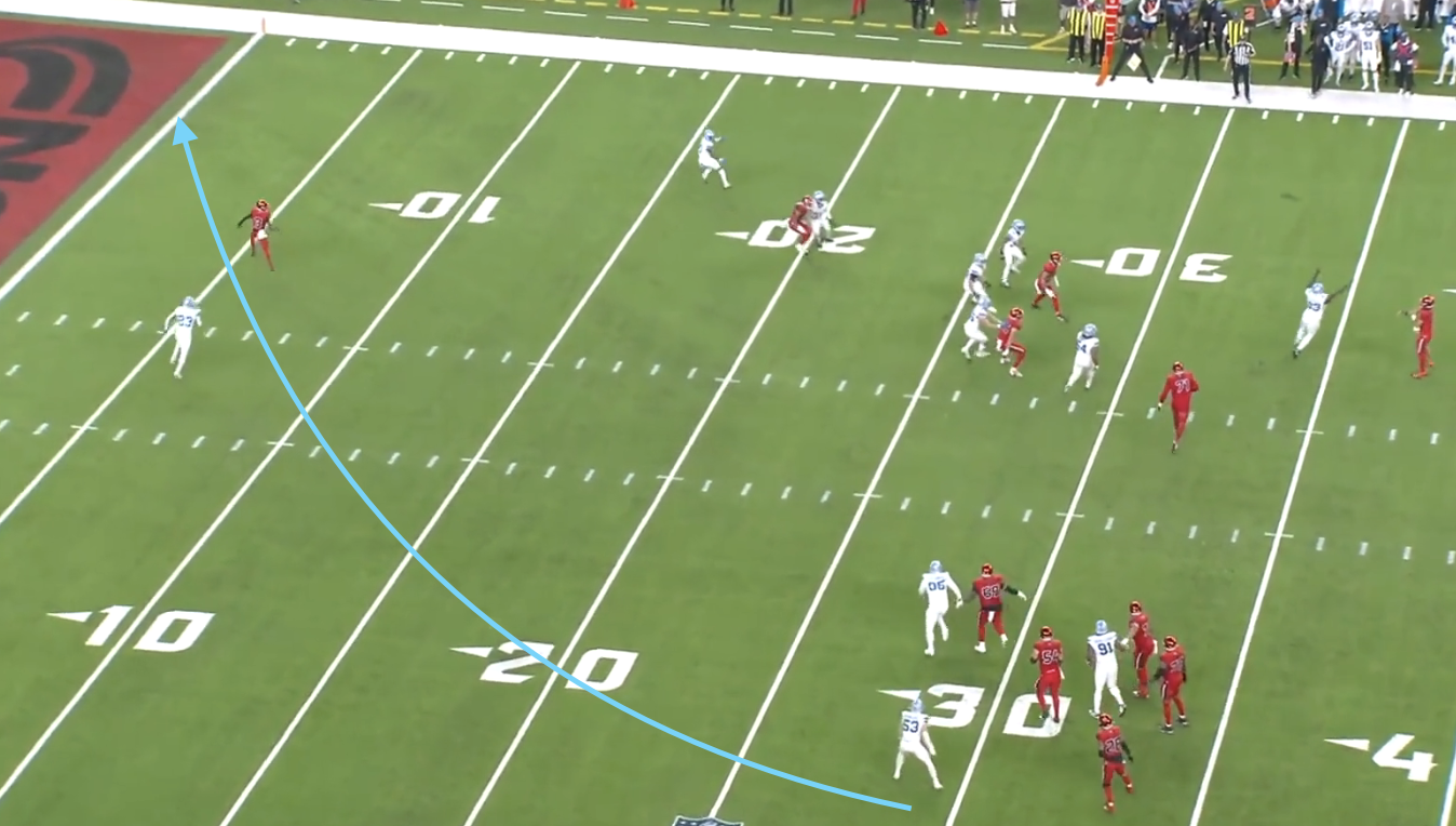 거의 같은 작전입니다. 라이온스는 리시버를 라인맨 더 가까이에 위치해서 수비를 라인맨이 갈 수 있는 정도로 잡아줍니다. 거기다 코너백이 리시버와 쿠션을 두고 떨어져 있기 때문에 리시버가 가장 위험한 수비수인 세이프티를 바로 막을 수 있습니다. 아몬라는 바깥으로 움직이지 않고 라인맨이 만들어주는 alley를 따라 들어가서 터치다운을 만들어 냅니다.