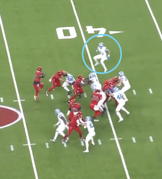 우선 라인베커들입니다. 믹슨에 대한 파악과 준비가 매우 잘 되어있다고 보입니다. 델이 모션으로 나아가지만 라인베커들은 갭 이동 이외의 크게 변화를 주지 않고 오직 믹슨의 움직임만 따라 갑니다. 특히 믹슨이 백사이드로 나아가는 것이 장기인 것으로 알고 라인베커들은 바로 갭으로 쏘기보다는 디라인들이 갭을 막으면 백사이드로 나아가서 플레이를 막습니다.