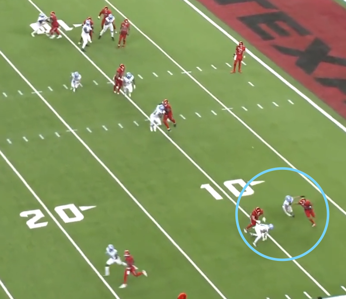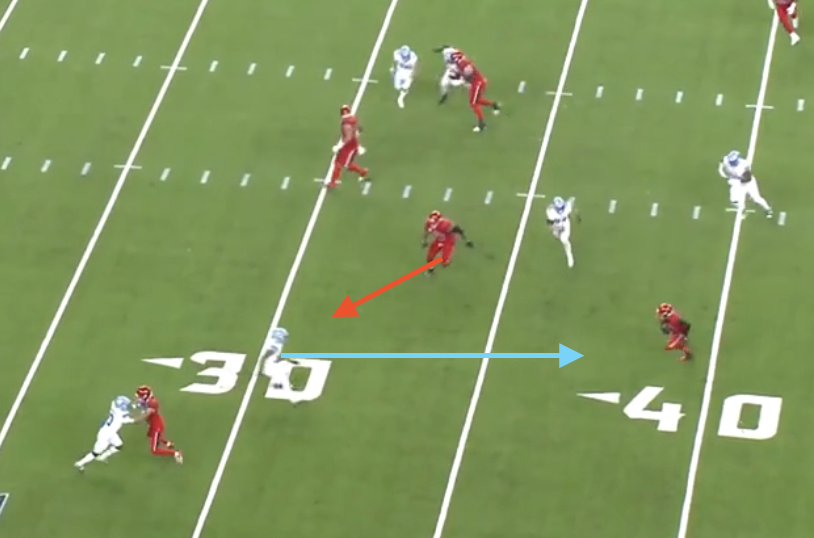 델의 모션 이후에 스크린 입니다. 세이프티가 뒤로 빠져있는 공간을 공략했지만 세이프티가 매우 빠르게 반응을 하면서 태클을 당합니다. 원래는 두 번째 사진의 빨간 화살표인 LT일 와서 블락을 해줘야 하지만 세이프티의 속도를 전혀 따라가지 못합니다. 여기서 델도 계속 바깥으로 움직이면서 세이프티를 LT에게서 멀어지게 하는 요인도 있었습니다.