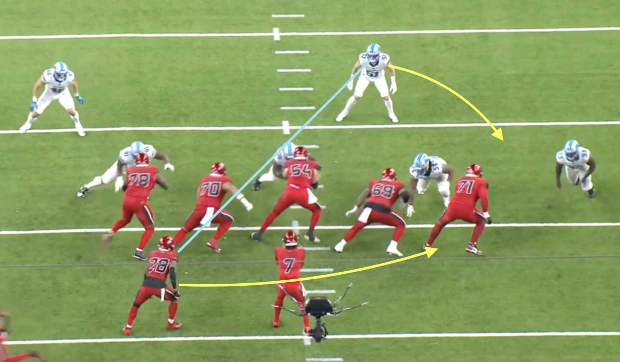 인사이드 라인베커는 믹슨만 보고 움직입니다. 갭을 바로 쏘지 않고 흘러나오는 믹슨을 그대로 수비 합니다. 거기다 백사이드 라인베커(두 번째 사진의 하늘색 화살표)는 믹슨의 컷백을 대비합니다. 이 작전은 RG 메이슨이 블락을 밀리기까지 하면서 망가졌습니다.