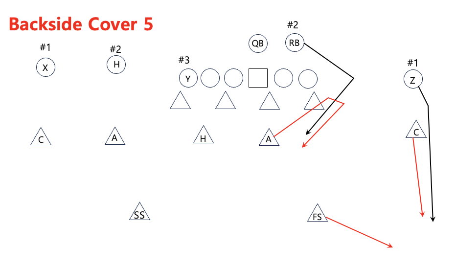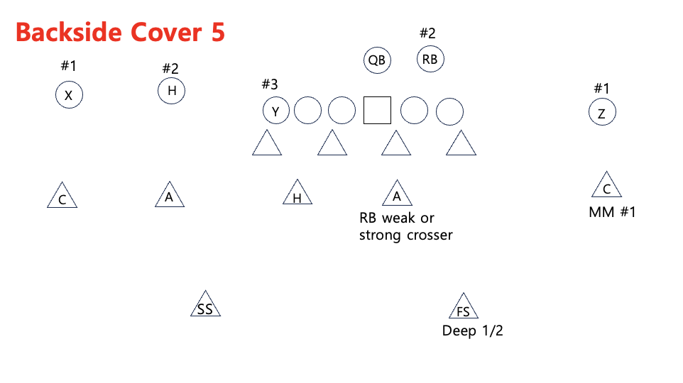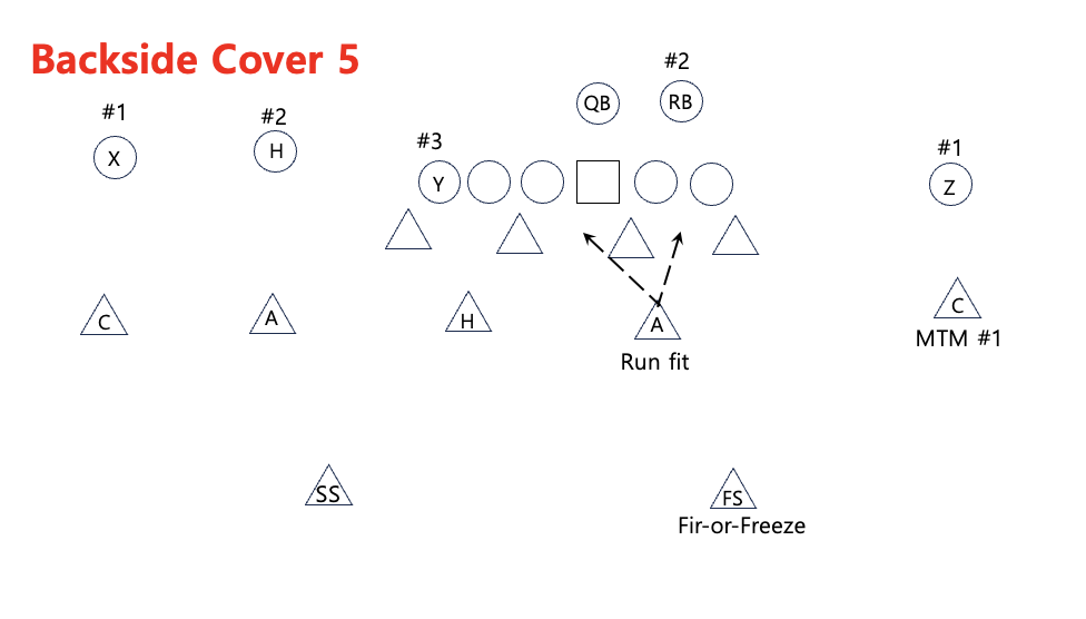 다음으로 Cover 5는 싱글 리시버의 모든 vertical route와 strong side #3의 모든 vertical를 상대로 상대적으로 안전한 커버리지로 선택할 수 있다. 양쪽에서 Safety가 Deep 1/2 zone을 나눠서 수비를 하는데, 맨투맨 수비가 아니기 때문에 Safety는 자신이 직접 막아야 할 리시버가 할당되지 않아 쿼터백을 보면서 플레이를 할 수 있다.