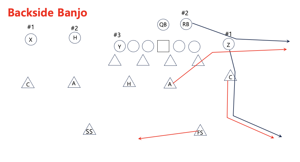 In/Out처럼 Banjo는 커버리지 콜이라기보다는 #1 싱글 리시버가 박스 근처에 있거나 타이트엔드를 상대할 때 사용하는 체크 콜과 같다.