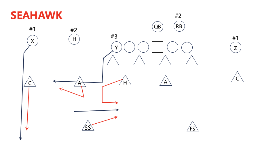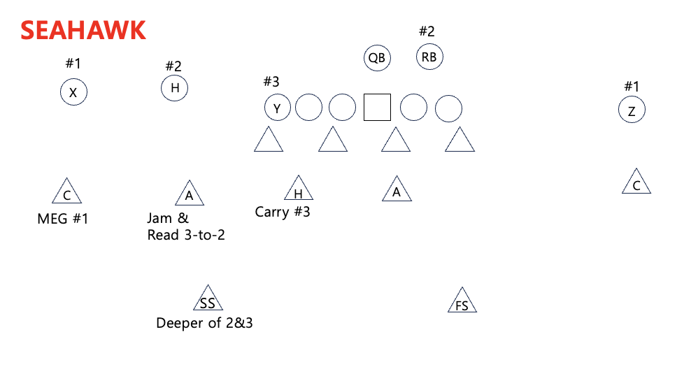 하지만 이렇게 변형을 주면 이번에는 모든 #3 리시버의 버티컬 라우트를 Hook이 막아야 하는 단점이 생긴다. Hook은 대부분 라인베커이기 때문에 매치업 이슈가 발생할 가능성이 높다. 그래서 수비는 Seahawk coverage를 사용하는 경우에서는 가장 커버리지가 좋은 라인베커나 때로는 defensive back type의 dime player를 Hook 자리에 두어야 한다.