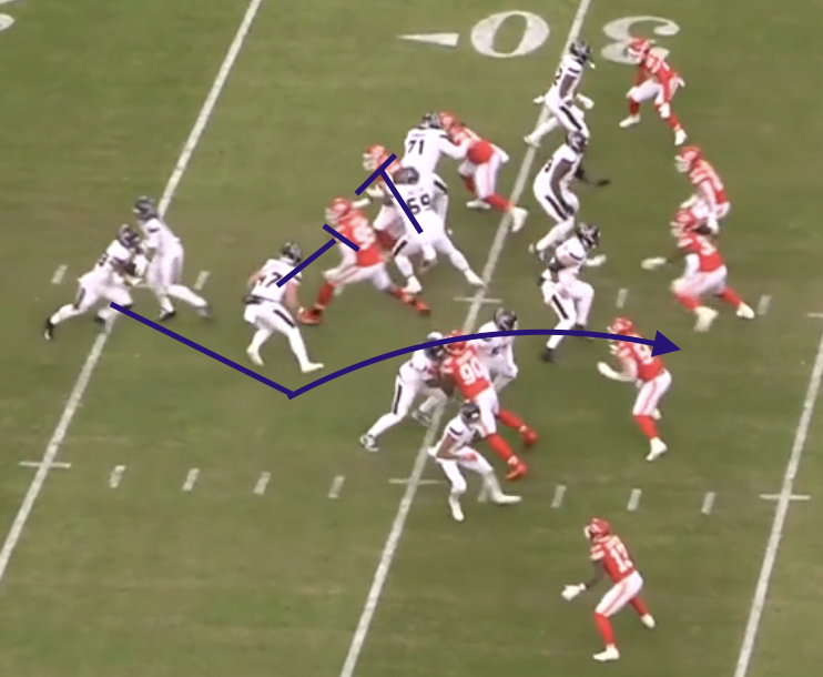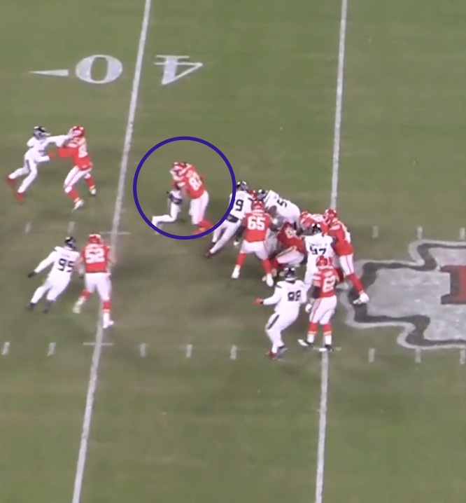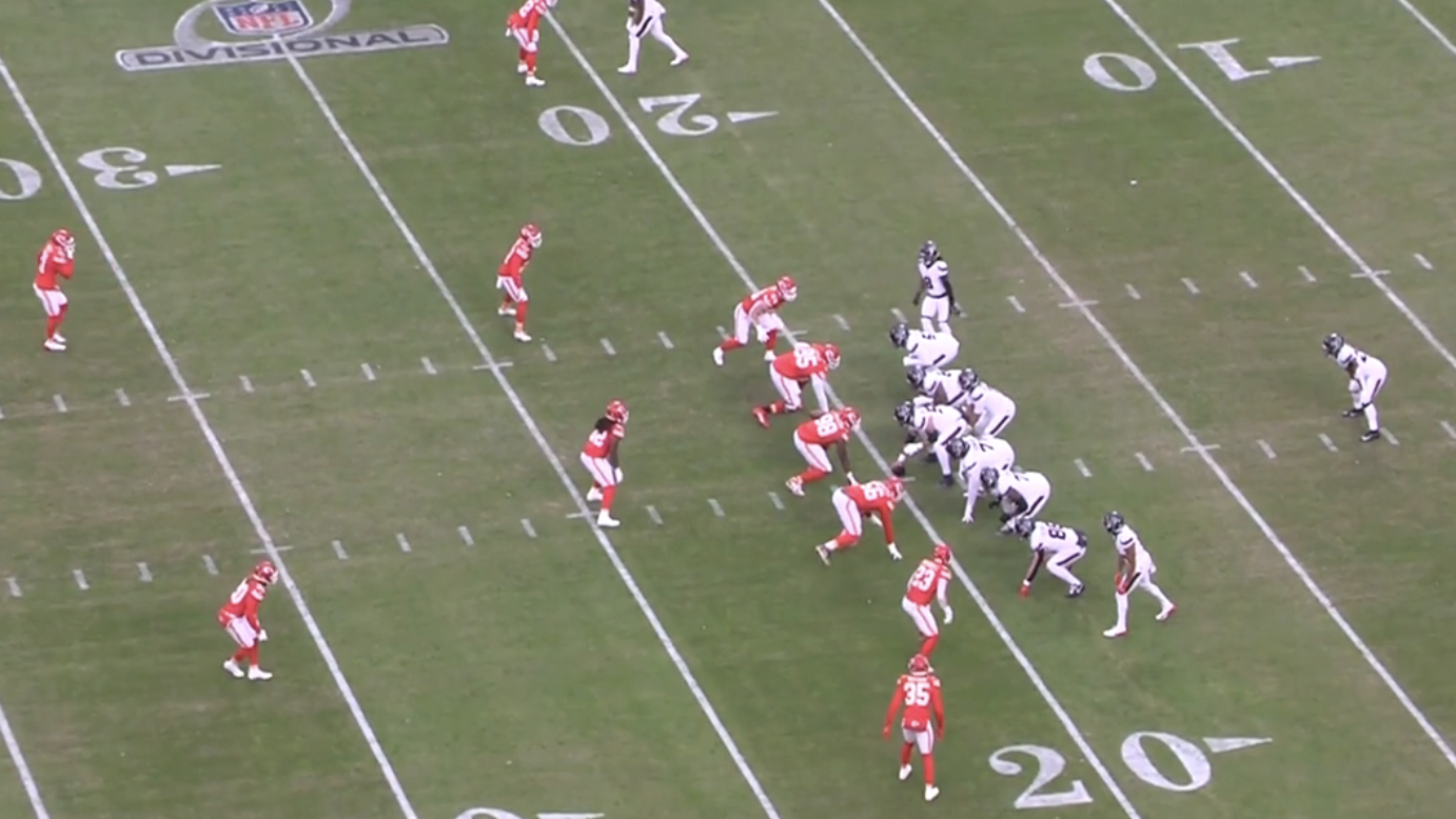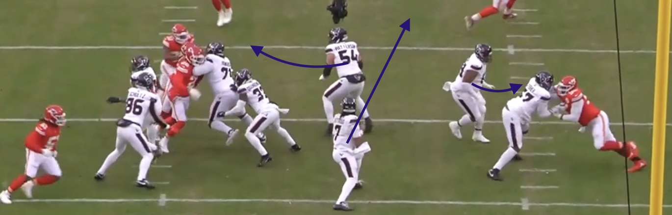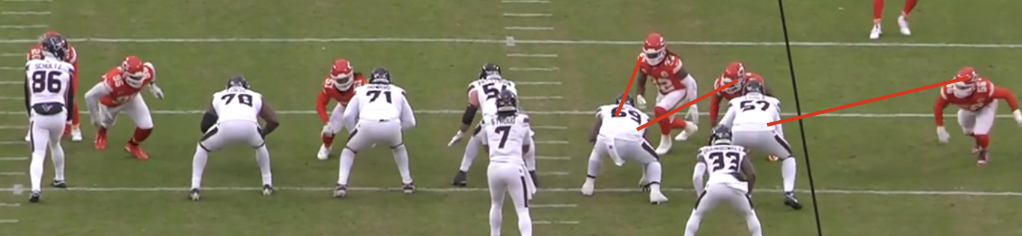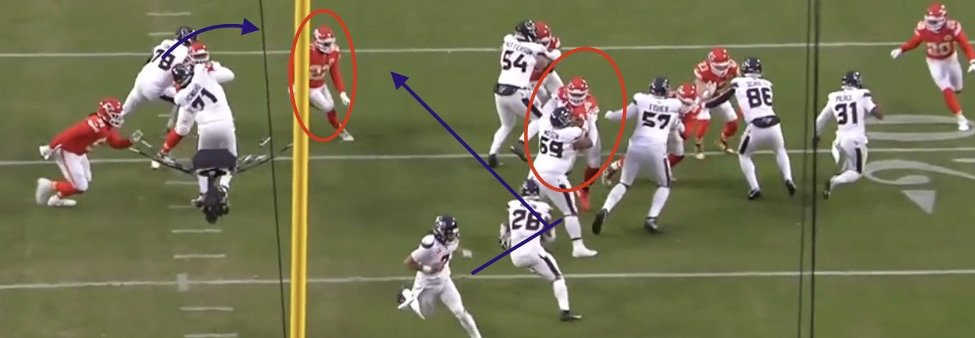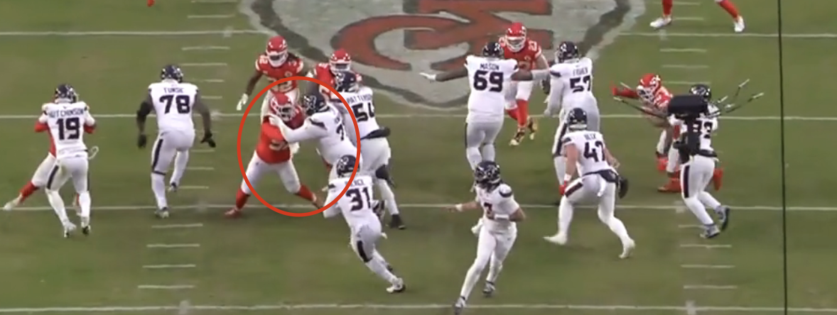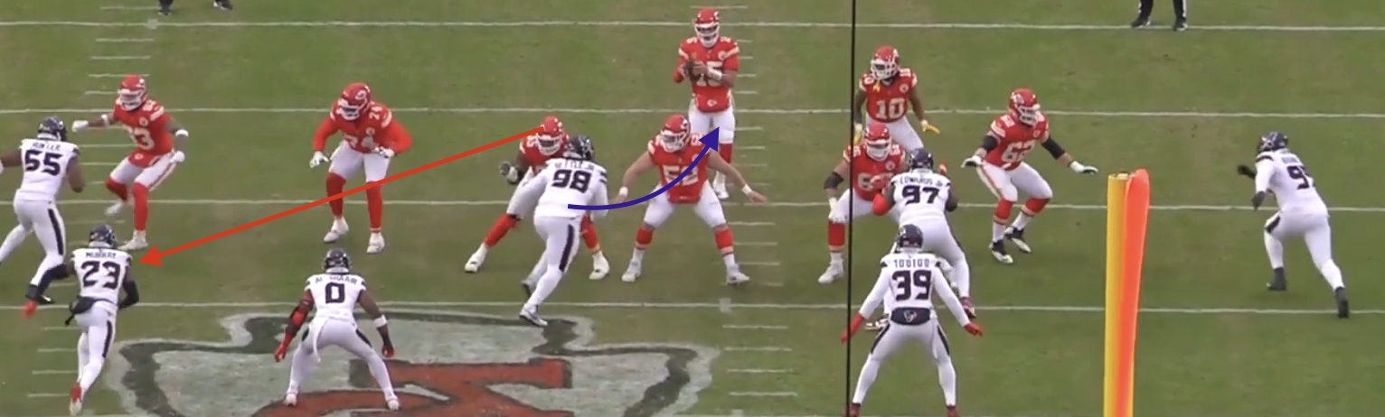 다음으로 켈시의 활용입니다. 켈시가 리시빙 타이트엔드로써 대활약을 펼친 것은 더이상 말하지 않아도 될 것 같습니다. 텍산스는 기존이라면 피트리를 시켜서 켈시를 막았겠지만, 피트리와 워드의 부상으로 켈시를 코너백인 브라이언트와 세이프티 머레이가 막아야 했습니다. 이런 선수구성의 미스매치를 칩스는 경기 후반 경기를 결정지을 런 플레이에 활용했습니다.