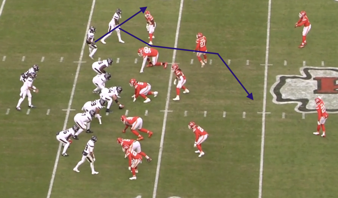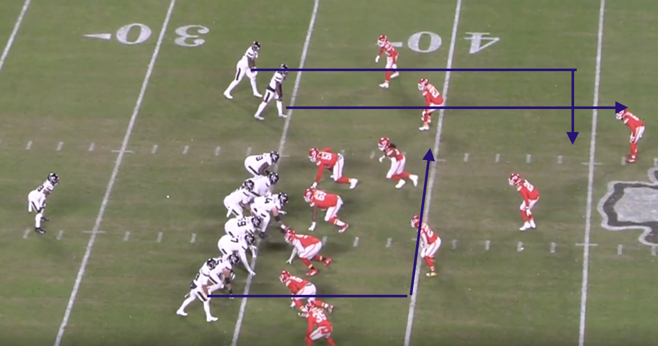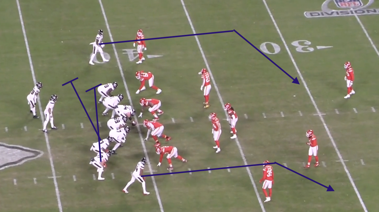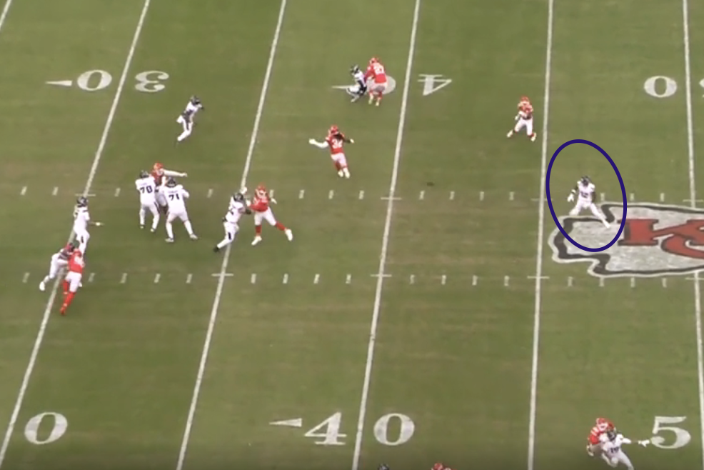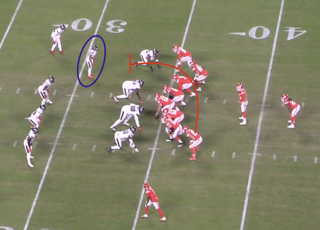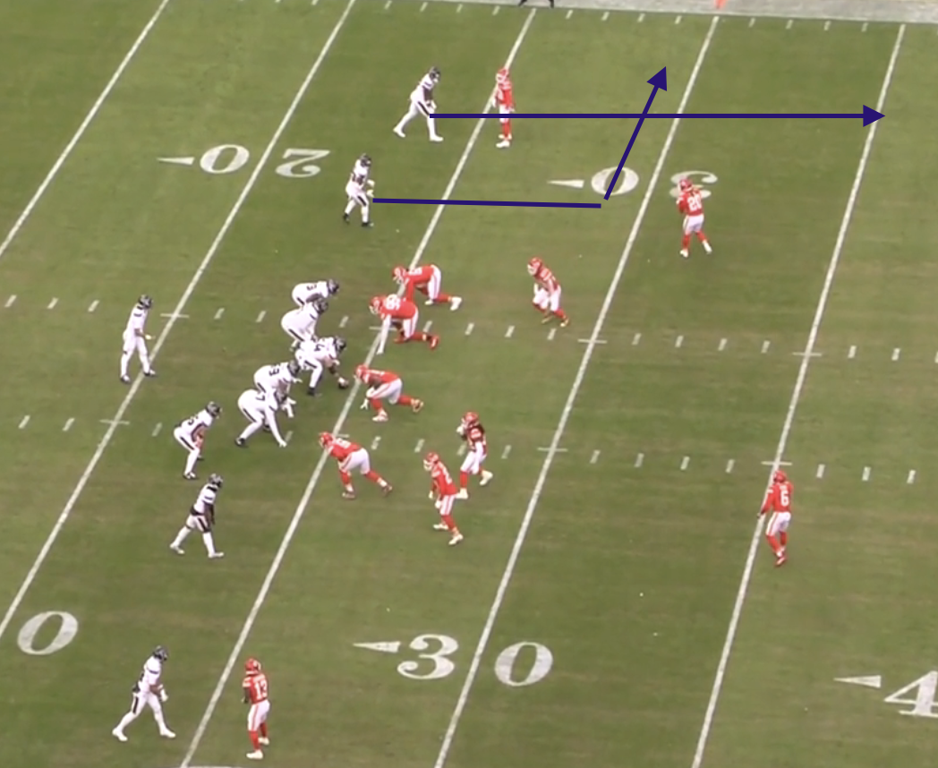 다음으로 켈시의 활용입니다. 켈시가 리시빙 타이트엔드로써 대활약을 펼친 것은 더이상 말하지 않아도 될 것 같습니다. 텍산스는 기존이라면 피트리를 시켜서 켈시를 막았겠지만, 피트리와 워드의 부상으로 켈시를 코너백인 브라이언트와 세이프티 머레이가 막아야 했습니다. 이런 선수구성의 미스매치를 칩스는 경기 후반 경기를 결정지을 런 플레이에 활용했습니다.
