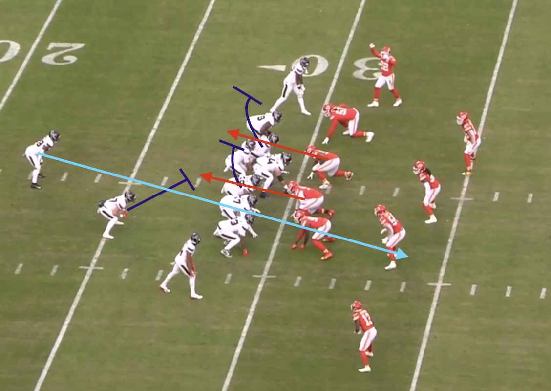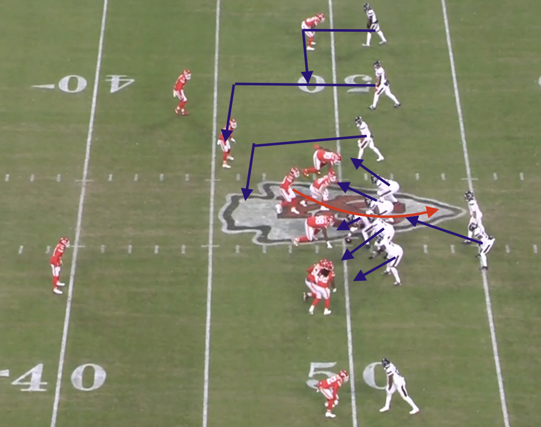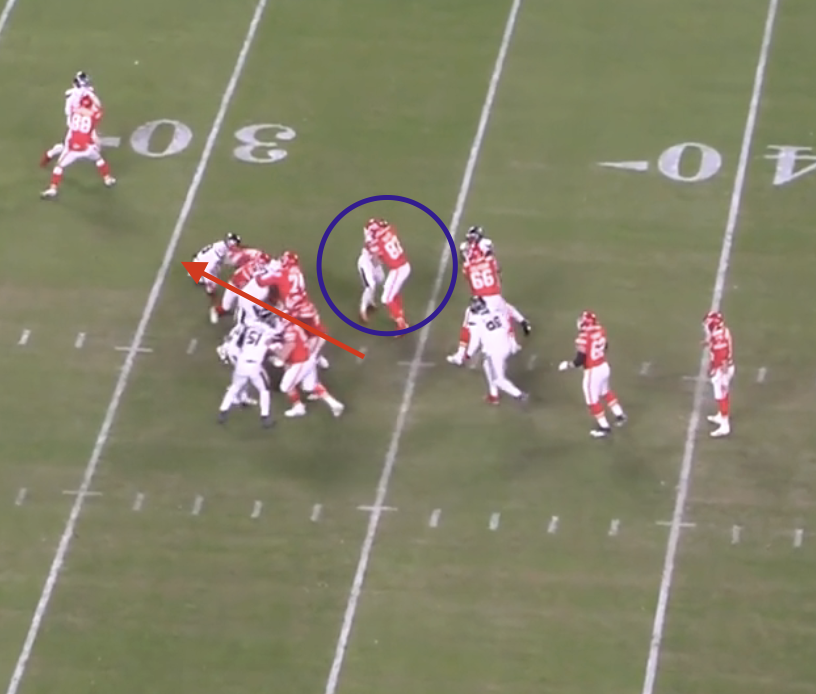 이번에는 B gap을 공략합니다. 56번은 멀게 돌아들어가면서 RT를 끌어내고, 98번은 RG 정면에서 그대로 들어가 32번을 막을 선수는 아무도 없습니다. 그대로 스트라우드 정면으로 들어갑니다. 칩스의 다이내믹한 블리츠 작전을 보면 오팬스 라인에서 놀고 있는 선수가 꼭 있습니다. 그만큼 오라인의 프로텍션을 비효율적으로 만드는 것입니다.