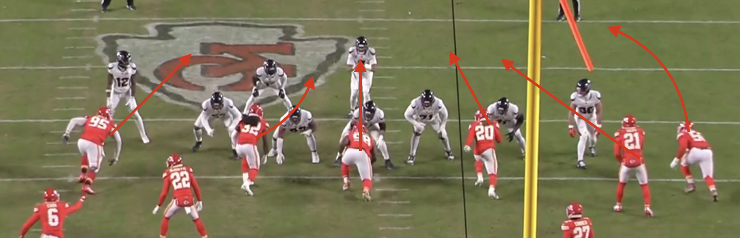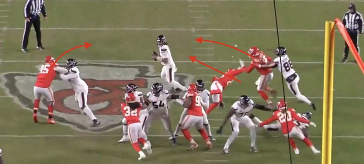 칩스 수비는 정말 다양하게 오라인의 전체를 개인 능력을 통해서 또는 구조적으로 공략을 해서 끊임없이 괴롭혔습니다. 그리고 콜린스에게는 더블 팀을 붙여서 콜린스만 막으면 된다는 생각으로 나왔습니다. 런에 대해서는 아웃사이드 존 스킴을 확실히 막아 결정적인 한 방을 날리지 못하게 억제했습니다.