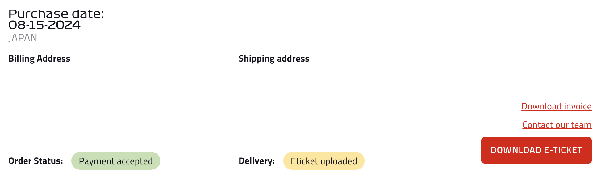 우리는 스즈카 티켓이 오픈 되기를 기다리면서 F1 ticket 사이트를 들락거렸다. 그러던 중 우연히, 정말로 아주 우연히 티켓이 오픈된 것을 보고 무언가에 홀린 듯이 티켓을 구매하였다. 그렇게 2024년 8월 15일 티켓을 구입했다. 추가적으로 올해는 실물 티켓이 아닌 QR 코드로 찍고 들어가는 방식인데, QR 코드를 받기 위한 링크가 (오른쪽 아래 빨가 박스의 DOWNLOAD E-TICKET) 정말 경기 며칠 전에 오픈이 돼서 상당히 마음을 졸이게 만들었다.