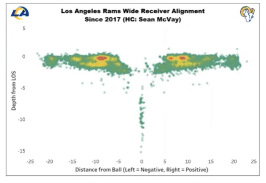 위의 그림은 2017년 Rams의 포메이션에서 리시버들이 위치한 지형도입니다.초록색-노란색-빨간색으로 갈수록 WR가 더 많이 위치했다는 것을 의미합니다. 공이 위치하는 0을 기준으로 WR들이 라인 가까이 위치하고 있다는 것을 볼 수 있습니다.