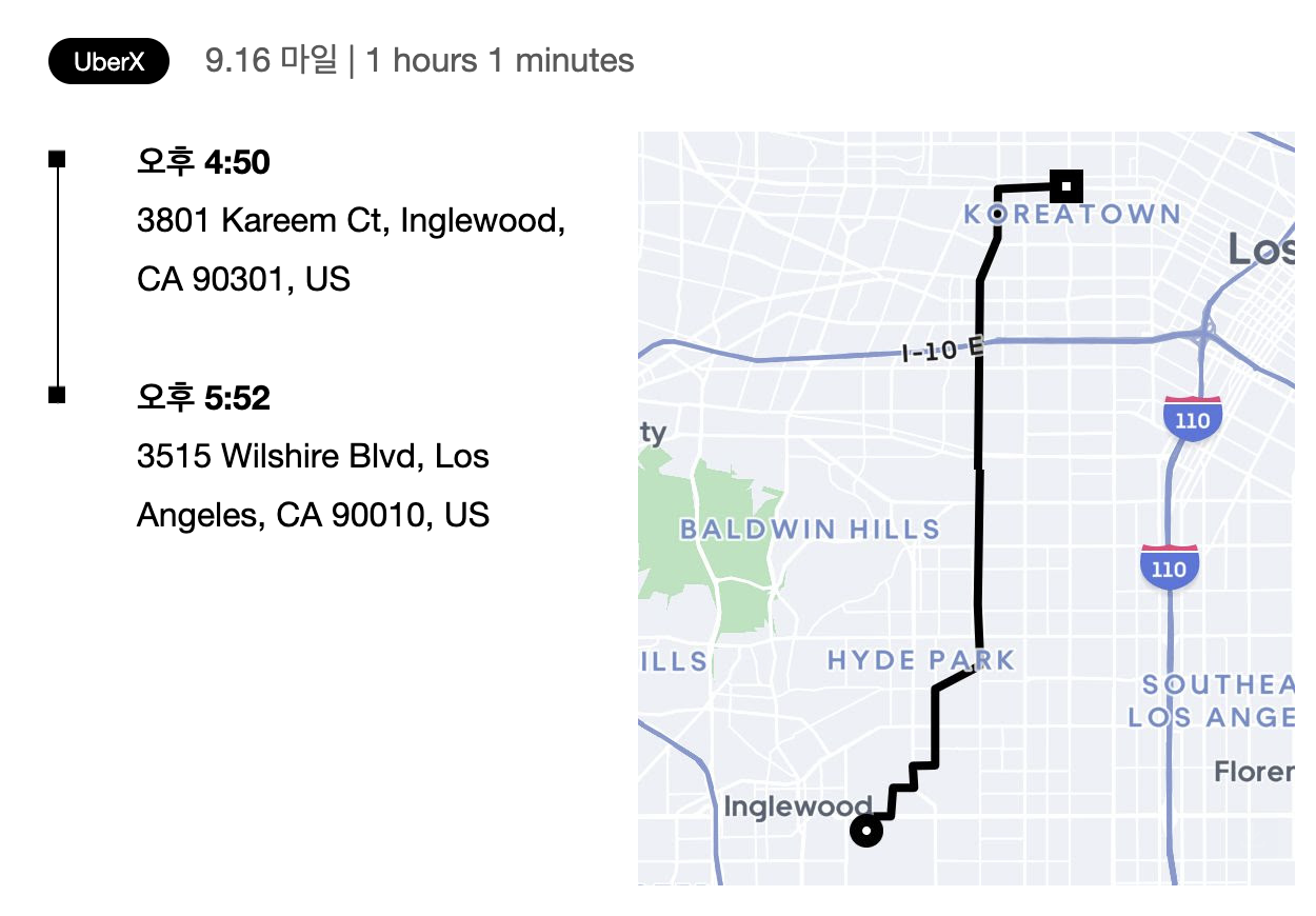 시간도 두 배, 가격도 두 배 이상... 우버 값이 정말 어마어마 하다.