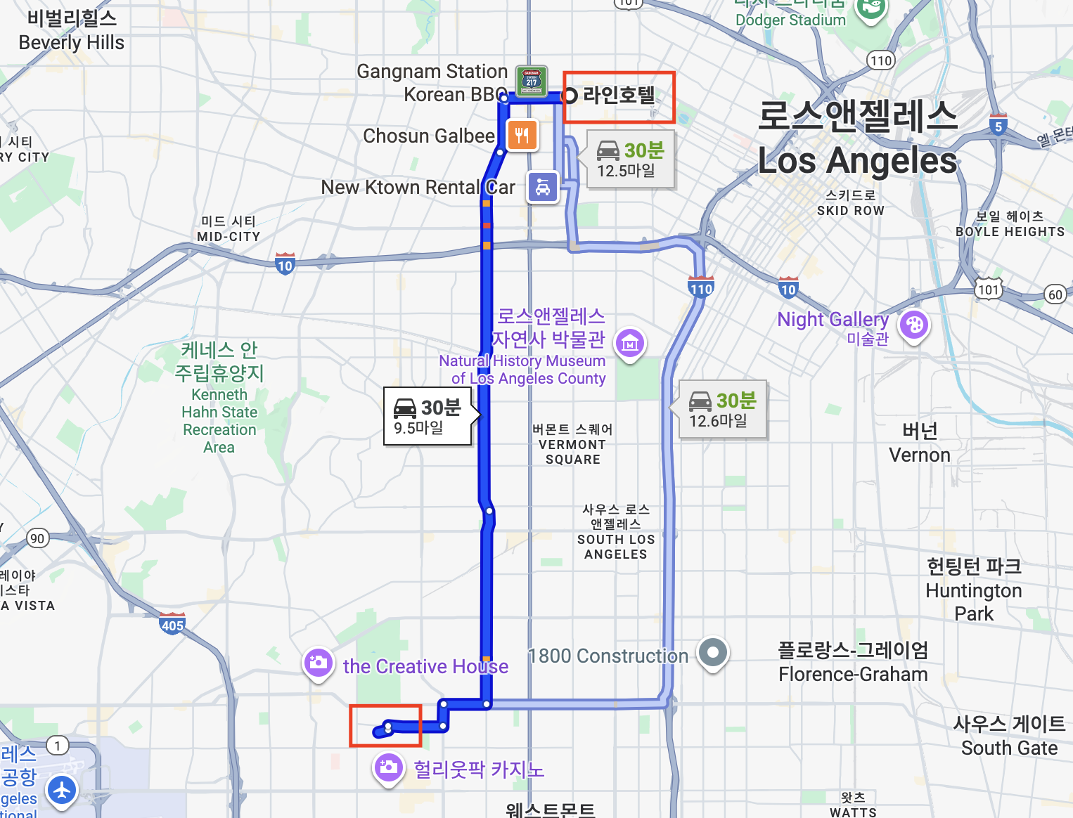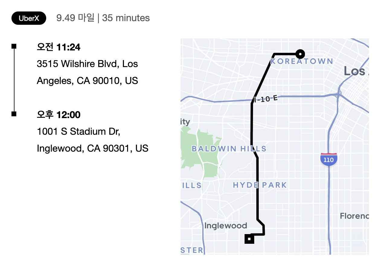 우리의 숙소였던 한인타운의 라인 호텔에서 SoFi Stadium까지 대략 30분이 걸린다고 나온다.