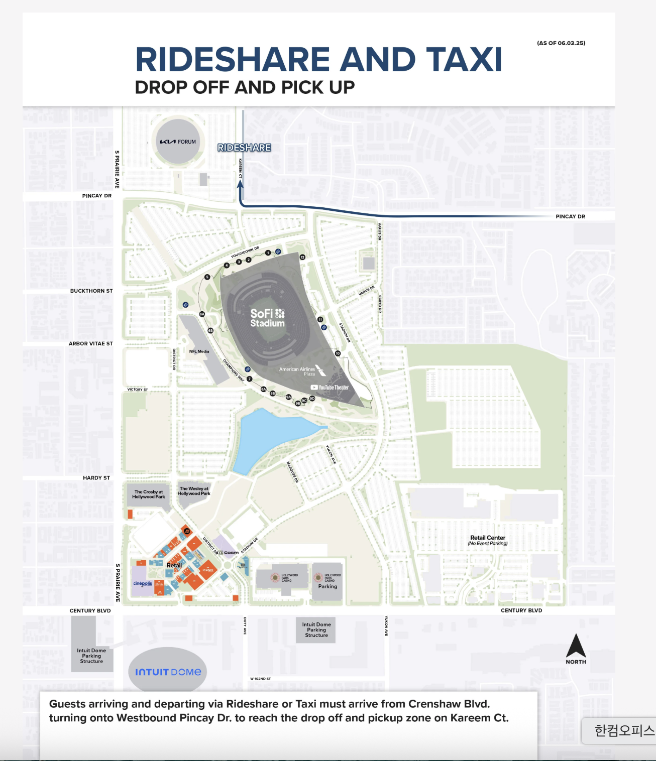 위의 그림을 보면 우버와 같은 서비스를 이용하는 사람들은 (그림 상) 경기장 위의 기아 포럼 앞에 내리도록 되어 있다.