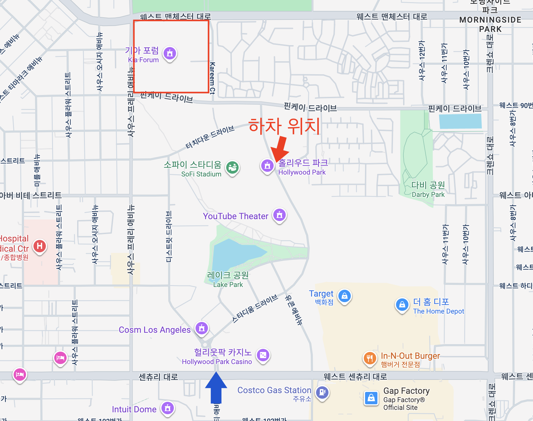 하지만 SoFi stadium의 랜드마크와 레이크 공원 그리고 Tailgate를 즐기기 위해서는 파란색 화살표에서 들어가는 것이 가장 적합하다.