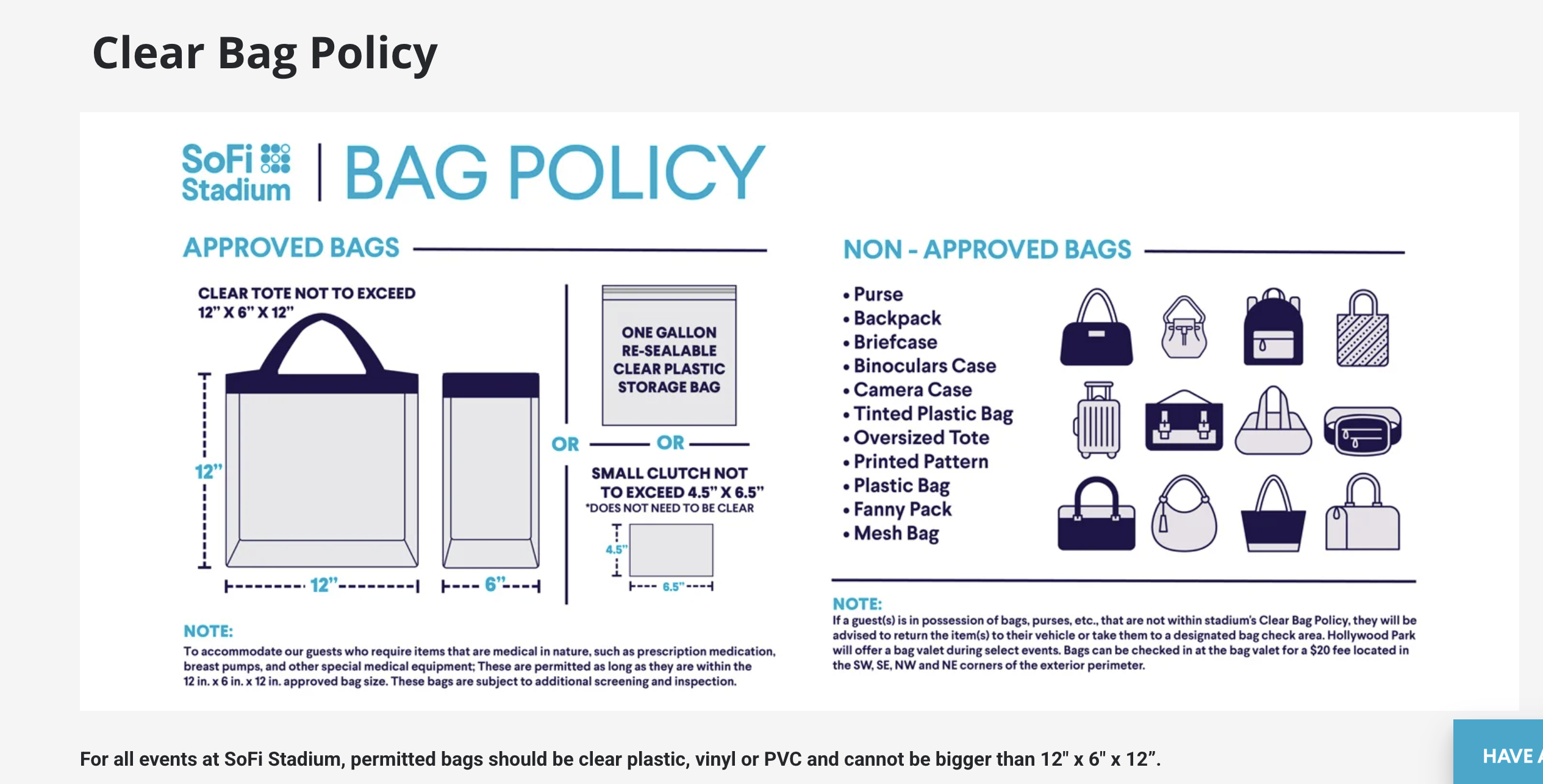1. 미리 SoFi Stadium 규정을 확인하고 필요한 물품을 준비한다. (사이즈에 맞는 투명가방)