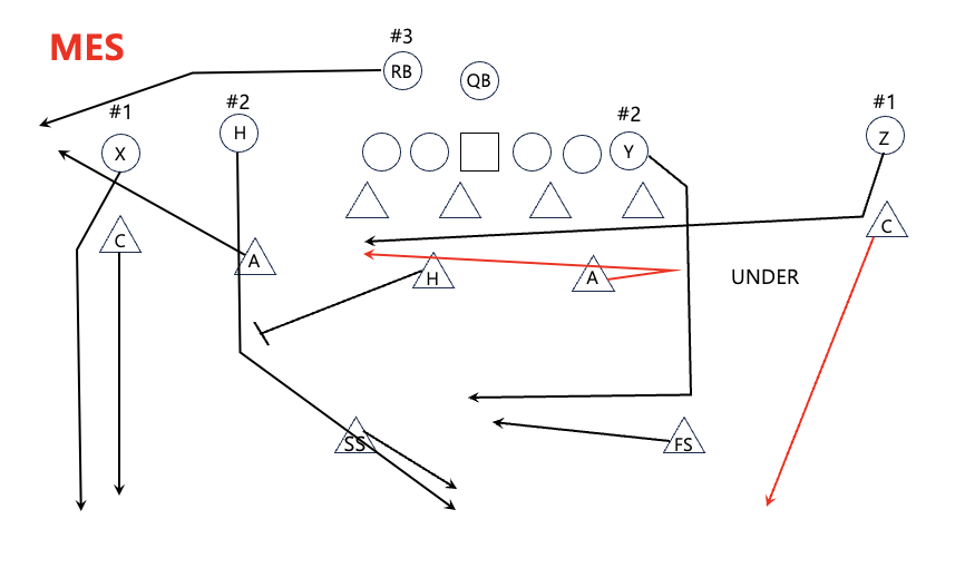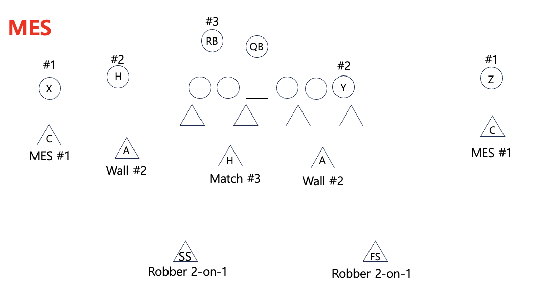 MES는 Man Except Shallow를 의미한다. Quarters type Triangle coverage에서 MEG(Man Everywhere he Goes) 다음으로 연습을 하는 커버리지이다. 기본적으로 MEG와 동일하지만, 유일한 차이점은 #1 리시버가 Shallow route 같은 underneath route로 안쪽으로 들어가면 커버리지가 변한다는 것이다. 원래는 #1 리시버를 막아야 하는 Cornerback은 #1을 놔주고 deep zone으로 쭉 빠진다 (bail tech) 대신에 #1 리시버를 막아야 하는 역할을 Apex가 대신한다. 왜냐하면 #1 리시버가 underneath route로 들어가면 뒤에서 쫓아가야 하는 CB 보다는 애초에 안쪽에 위치하는 Apex는 underneath route 경로에 앞에 있기 때문에 더 우위에 있을 수 있다. (이게 소위 말하는 leverage에서 이점이 있다는 의미이다.)