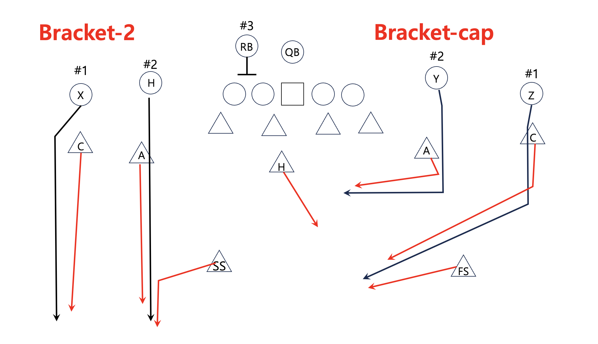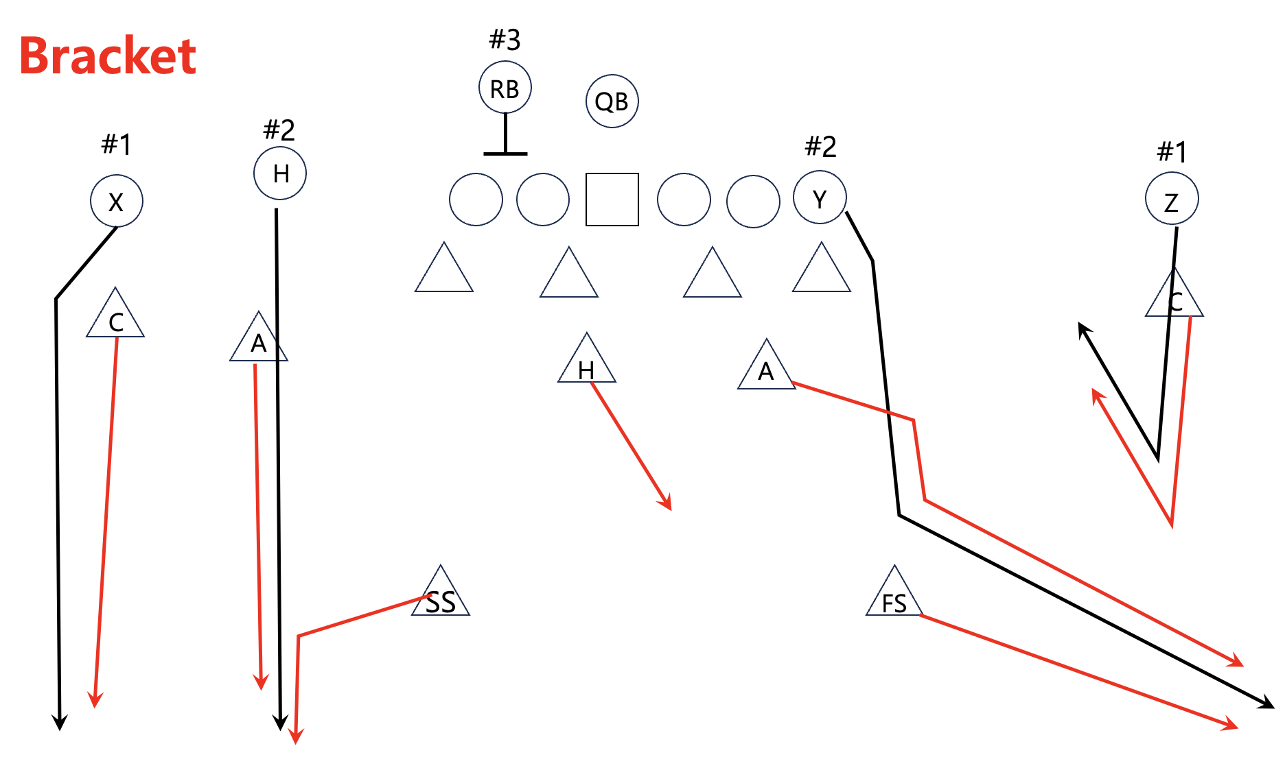 Bracket coverage와 Bracket의 친척인 Switch coverage(추후 설명)는 triangle coverage에서 #2리시버를 막는 Apex를 돕기 위하여 사용되는 커버리지이다. 대부분은 slot receiver를 상대로 하지만 receiving Tight end를 상대로 할 때도 사용할 수 있다. 위의 예시는 Saban 계열의 Bracket 버전이지만,같은 이름과 개념의 Bracket이라고 할지라도 시스템에 따라서 서로 다른 모습이 가능하다.
