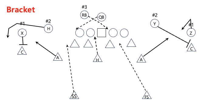 다음으로 볼 커버리지는 bracket coverage이다. 일반적으로 bracket이라고 하면 한 명의 리시버에 두 명의 수비수를 붙이는 double coverage를 의미하는 경우가 많다.