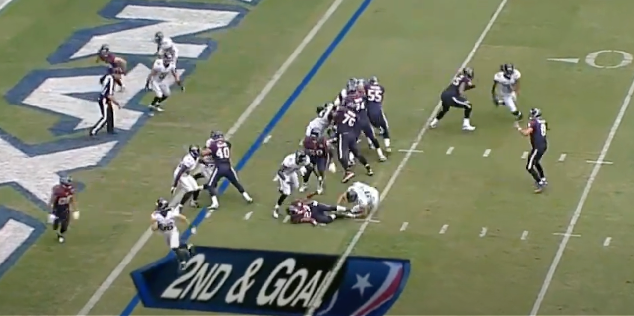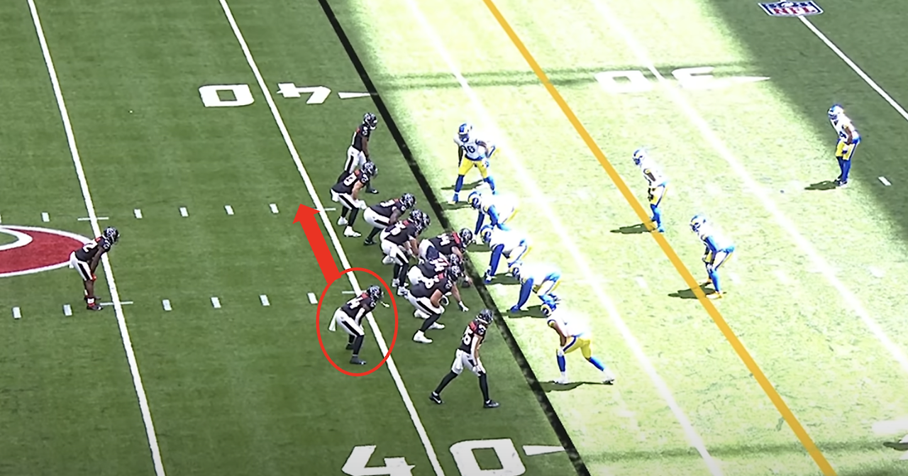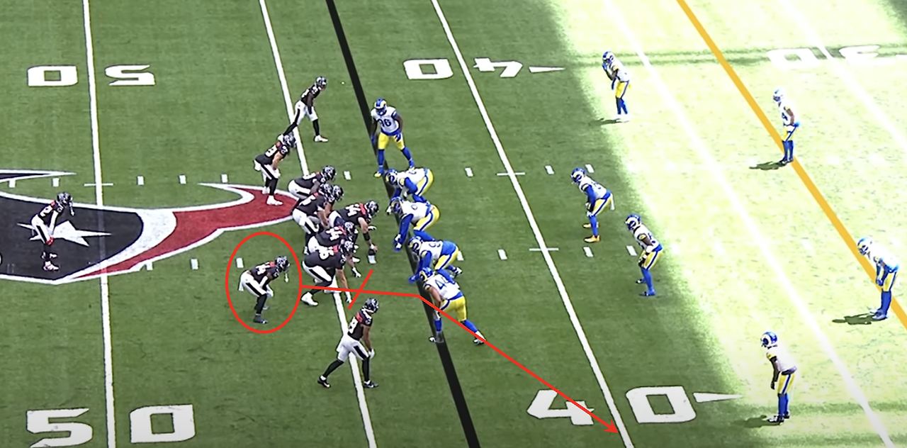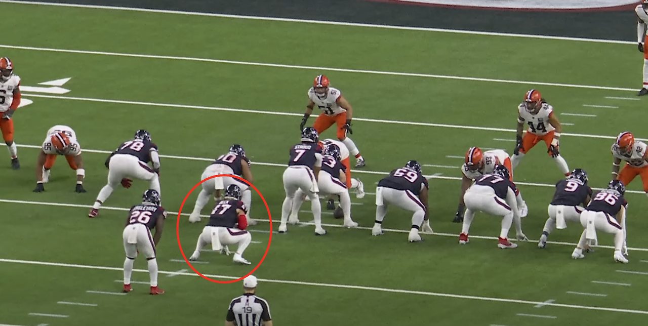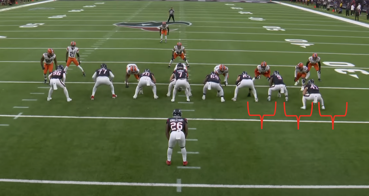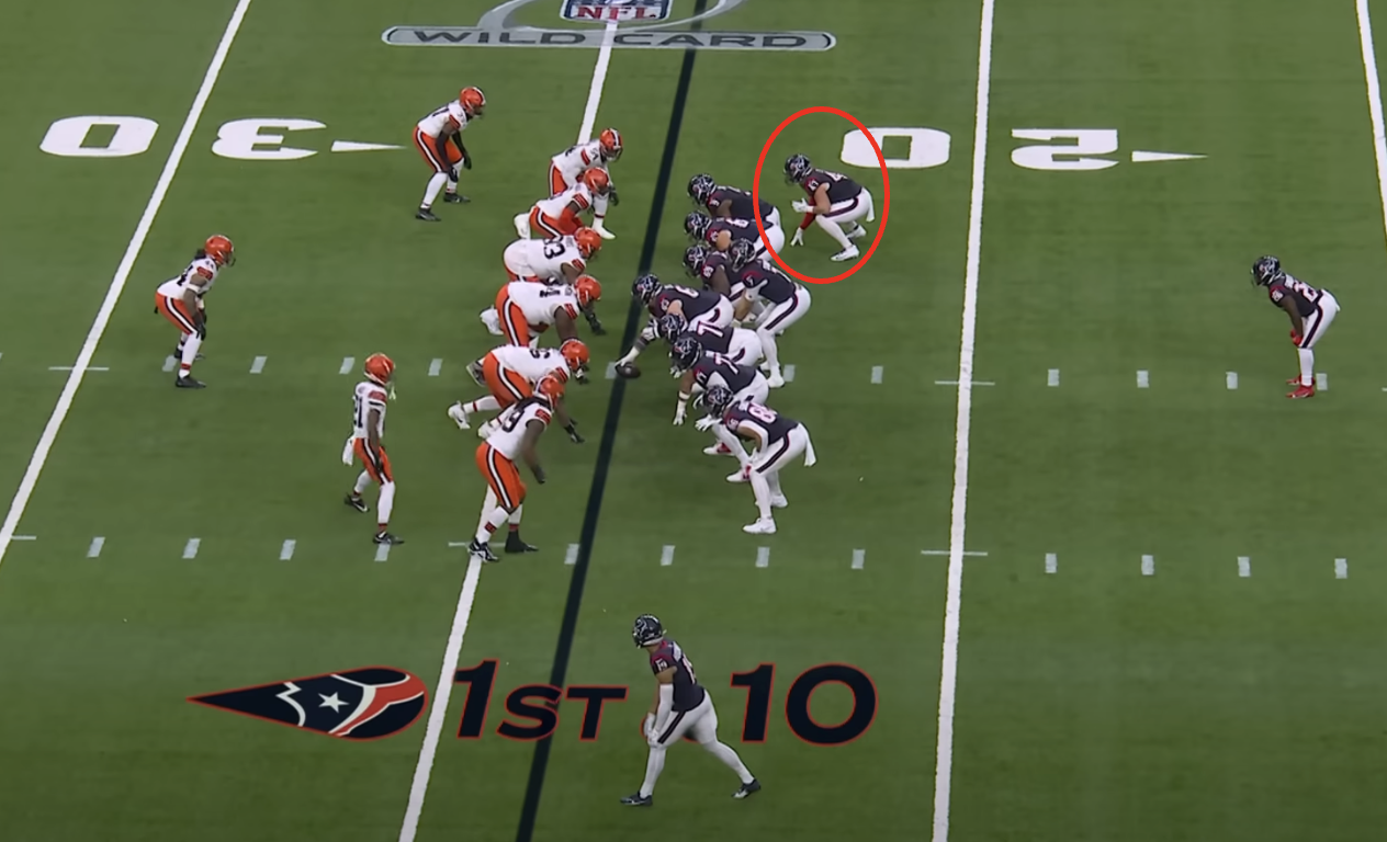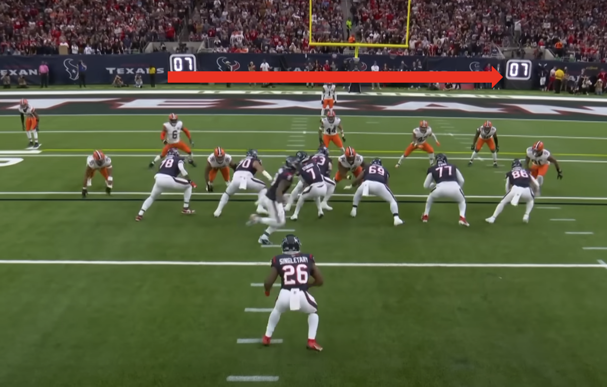 왼편의 Brevin Jordon이 off 위치에 있다가 모션으로 오른쪽으로 이동하면 양쪽 고르게 분포되있던 것이 순간적으로 오른쪽으로 무게가 쏠리게 됩니다. 그러면 Browns의 라인베커는 이에 맞춰서 움직임을 오른쪽으로 가져갈 수밖에 없습니다. 거기다 Stroud의 play acition까지 더해지면 확실히 쏠리게 만듭니다.