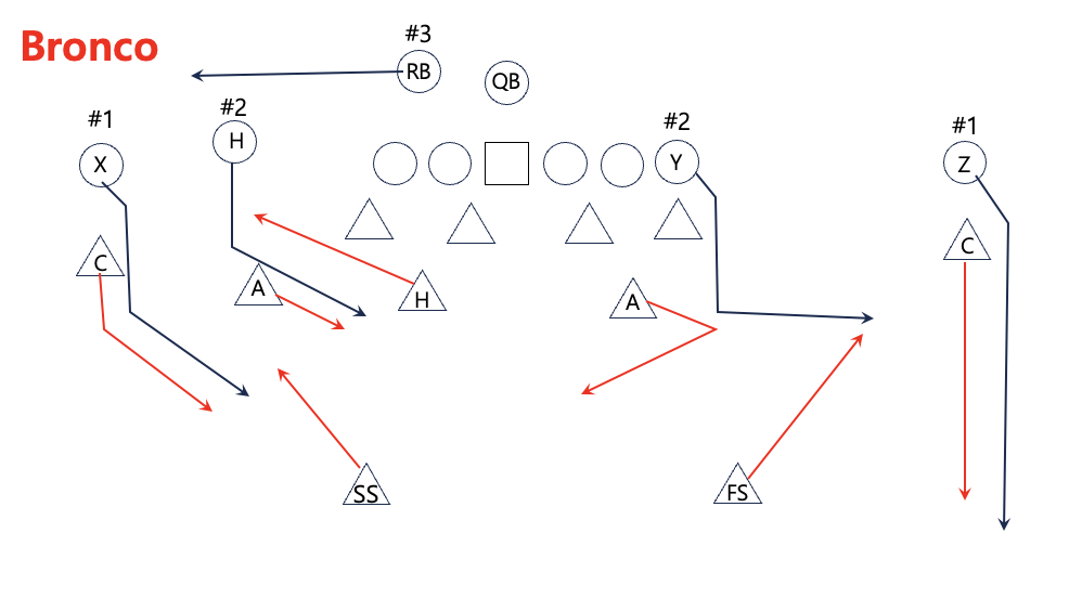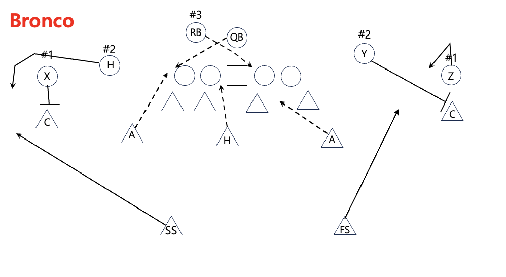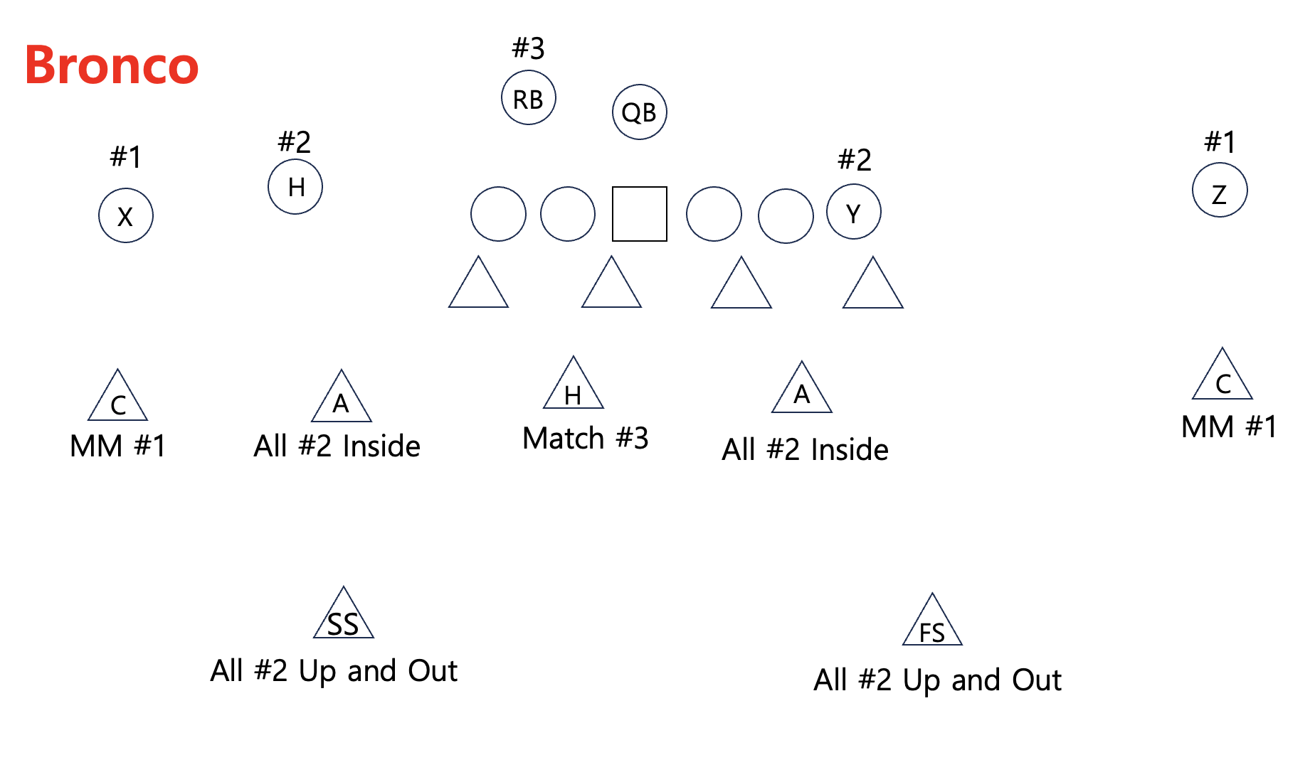 브롱코가 사용되는 가장 우선되는 이유는 weak 사이드 Apex가 드롭백 패스를 상대로 커버리지에 참여하면서도 RPO에서는 런 핏에 참여할 수 있게 해주기 위해서이다. 다시 말해서 A의 런에 참여하는지 패스에 참여하는지 conflict를 줄여주기 위함이다.