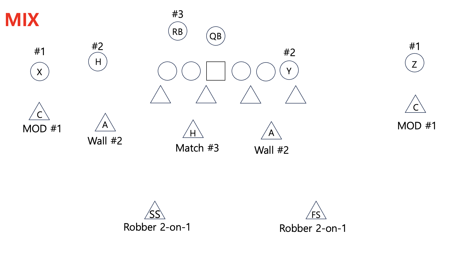 Hook: 반대편의 커버리지 콜에 따라 역할이 변할 수 있다. 일반적으로는 Hammer 플레이를 한다. 지정된 수비수가 없는 #3(일반적으로 러닝백인)를 담당한다. 만일 담당한 #3가 없는 경우에는 뒤에서 앞으로 (deep to short) 움직이면서 hook area를 막는다.