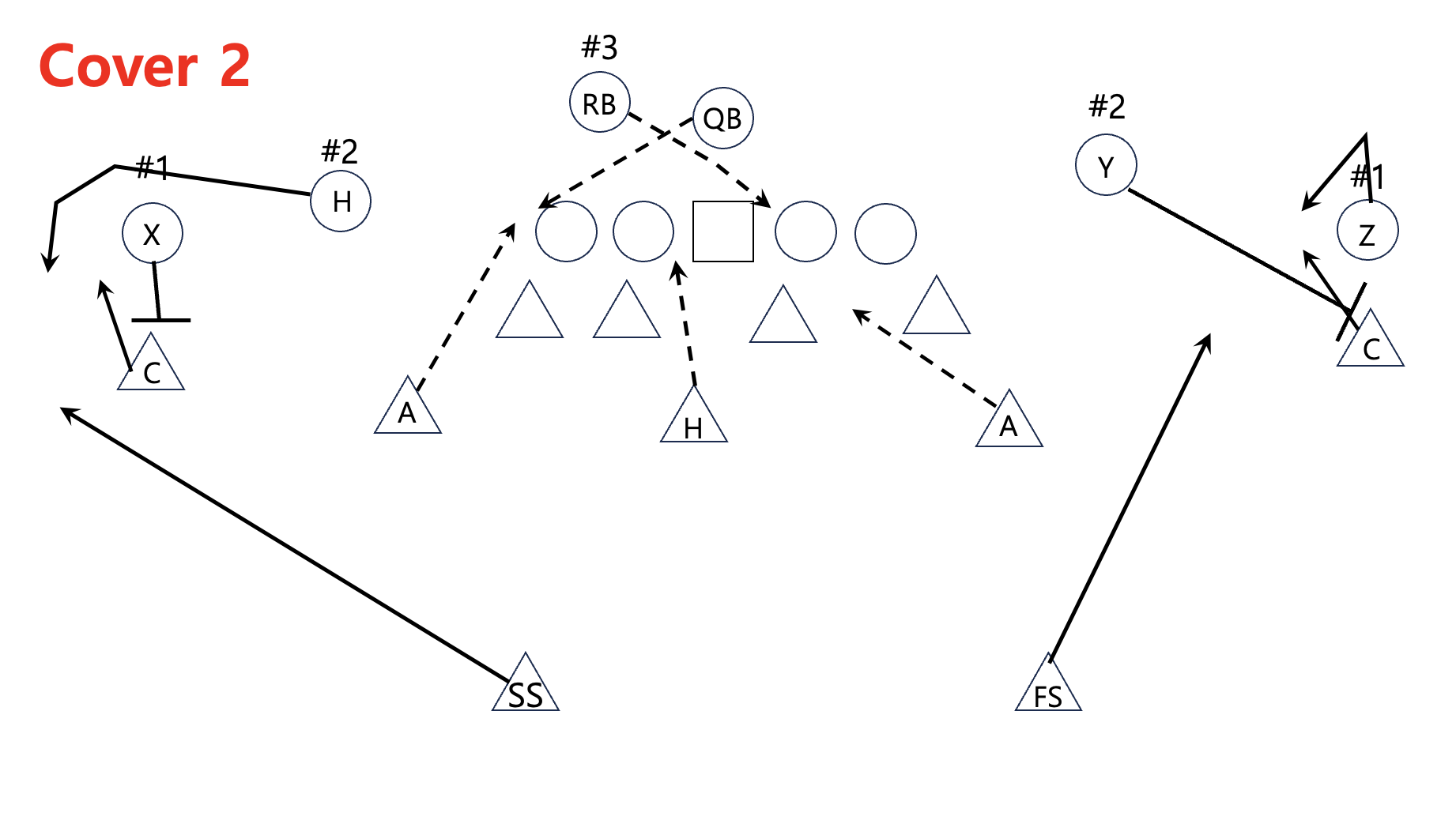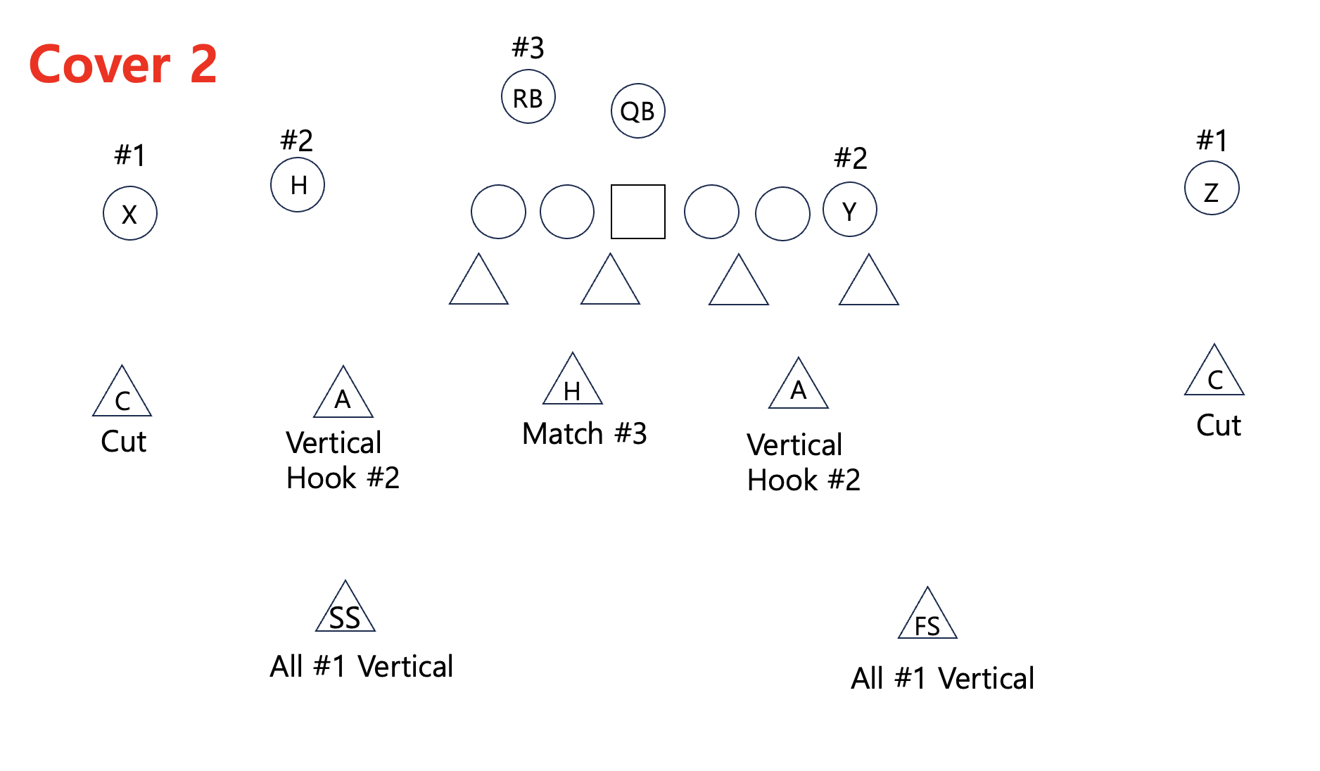 2-3) Safety: 모든 #1 리시버의 vertical route를 맨투맨 수비를 기본으로 한다.