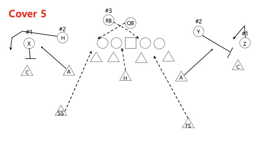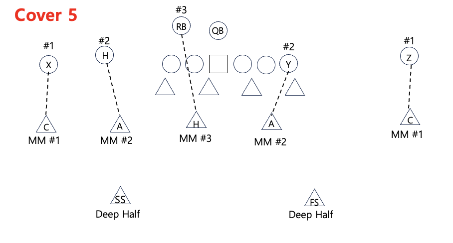 Cover 5는 단순히 underneath에서 자신 앞의 선수를 맨투맨 수비를 하는 방식이다. 모두 맨투맨 수비를 하는 기본 구조에서 Deep Safety를 두 명 둔다. 그렇기 때문에 3rd & long 상황 등에서 공격이 deep vertical routes를 사용할 가능성이 높은 경우에 가장 많이 사용된다.